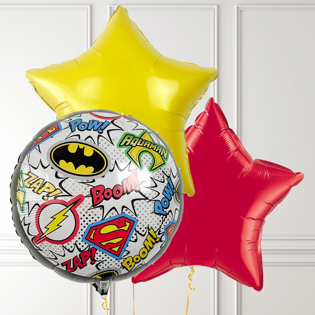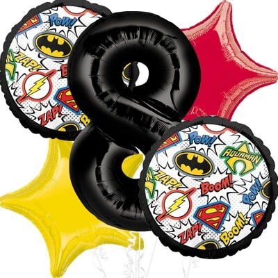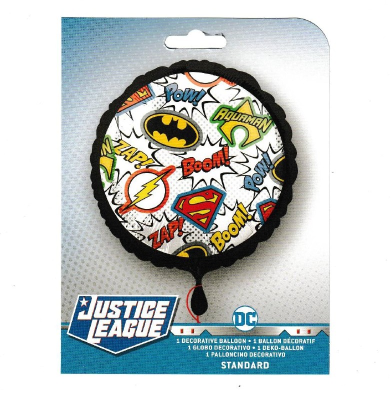 Объёмный фольгированный шар с изображением эмблем супергероев Лиги справедливости станет ярким акцентом на детской или тематической вечеринке.