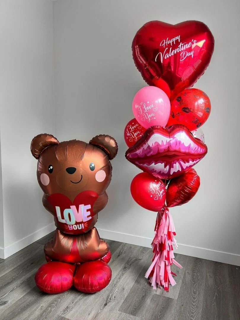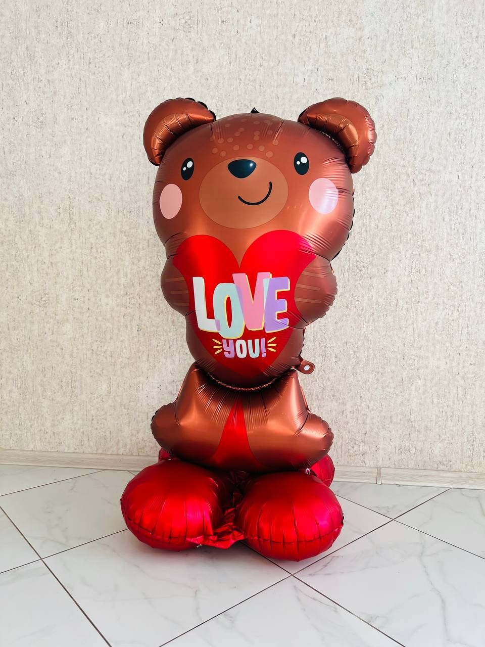 Большой фольгированный шар в форме мишки, держащего сердце с надписью «LOVE» — это идеальный выбор для создания праздничной атмосферы. Яркий и красочный, он станет настоящим украшением любого мероприятия.