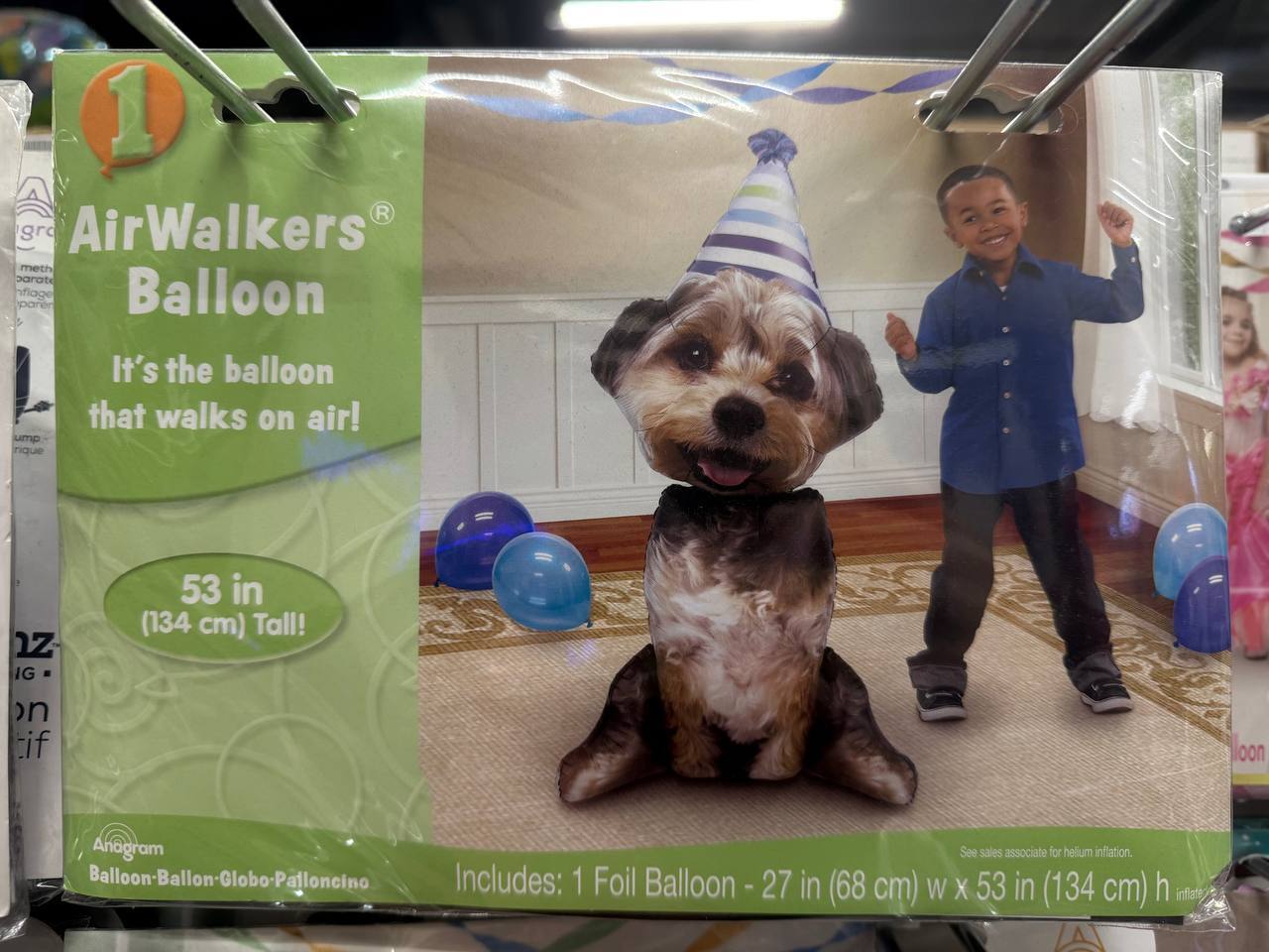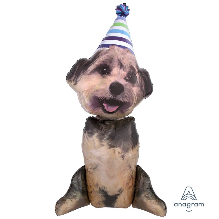 Объёмный фигурный шар (ходячий) в виде щенка в праздничном колпачке — эффектный и оригинальный подарок для любителей животных и ярких деталей декора. Ходячая фигура, наполненная гелием, свободно перемещается по воздуху, а небольшие грузики в нижней части предотвращают её неконтролируемое взлетание, не ограничивая при этом лёгкого движения от дуновения ветра.