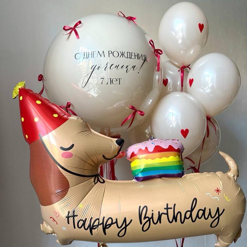 Объёмный фольгированный шар в форме очаровательной таксы в праздничном колпаке станет эффектным акцентом любого торжества.