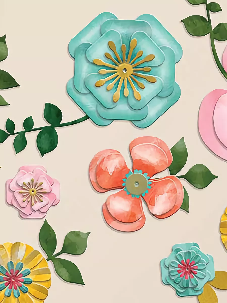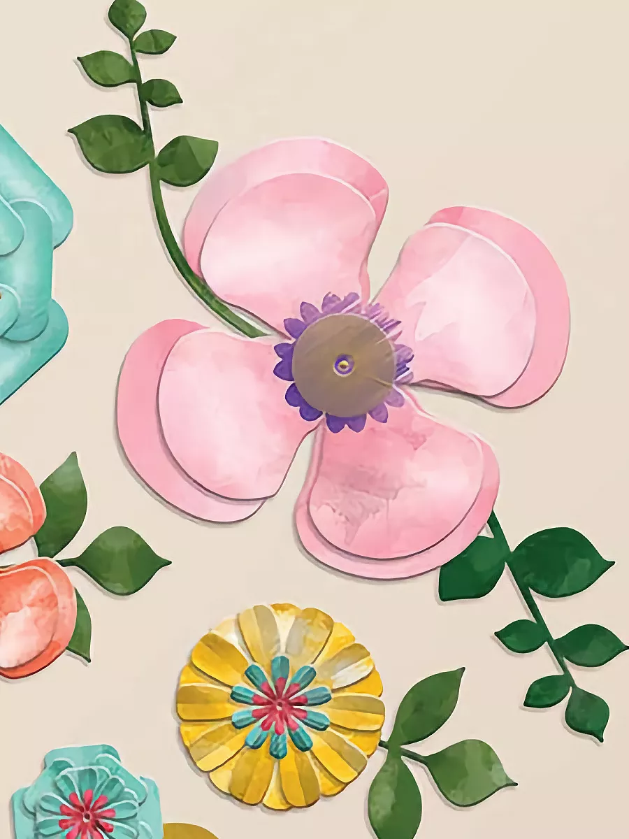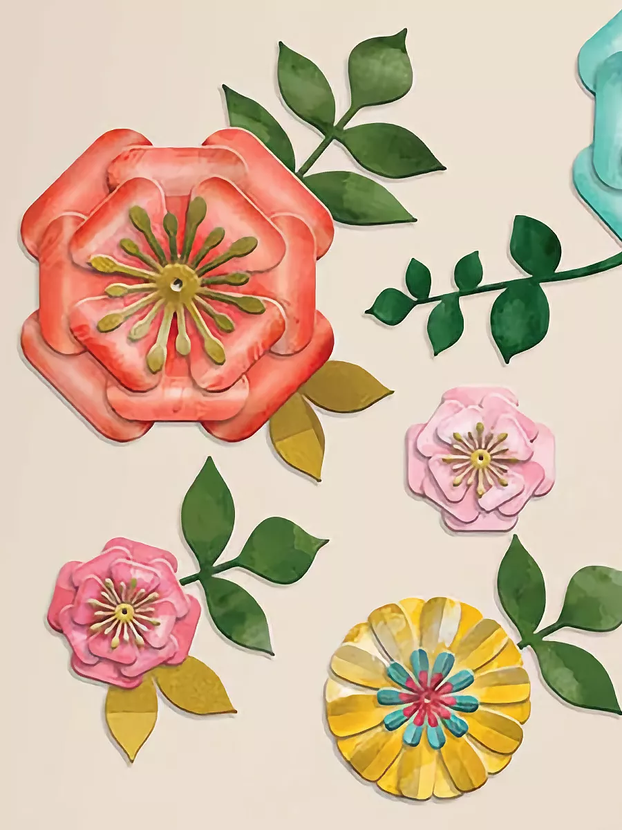 Комплект включает в себя цветы и веточки с листьями. В нём представлены цветы трёх размеров: небольшие (9,5 см), среднего размера (14 см) и более крупные (21,5 см и 27 см). Также в комплекте 11 веточек с листьями.
