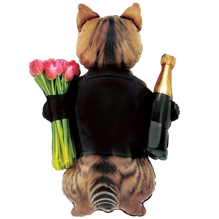 Воздушный фольгированный шар в форме брутального кота с букетом и шампанским — оригинальный подарок или элемент декора. Шар украшен изображением тюльпанов и бутылки шампанского, что придаёт ему праздничный и забавный вид.