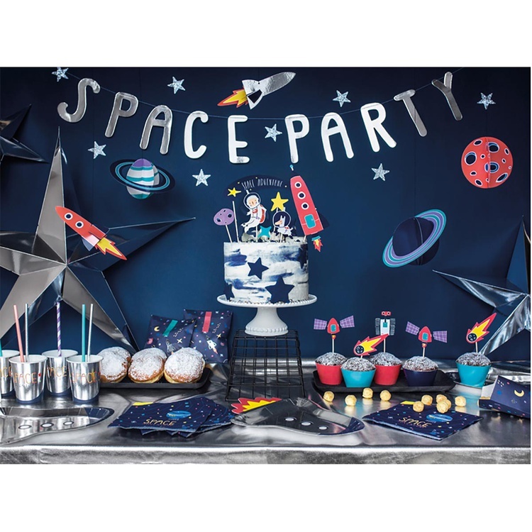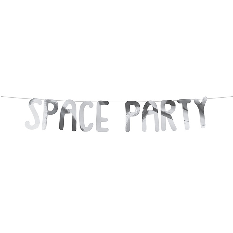 Серебряная гирлянда-буквы «Space Party» в космическом стиле длиной 96 см — идеальное украшение для праздничного интерьера.