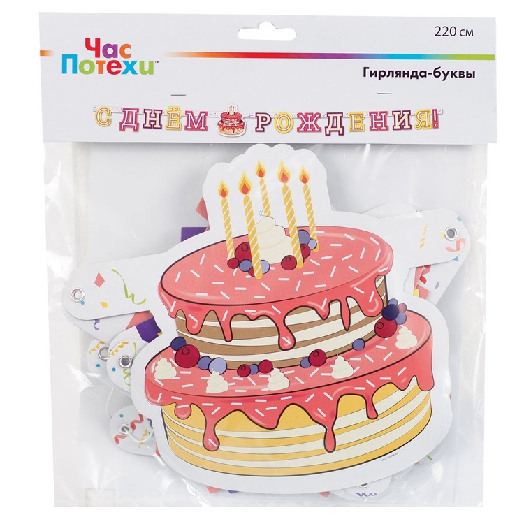 Яркая гирлянда-буквы «С Днем Рождения» с принтом «Торт Праздничный» длиной 220 см — идеальное украшение для праздничного интерьера. Яркий дизайн добавит настроения любому торжеству, а качественный материал гарантирует долговечность и лёгкость в развешивании.