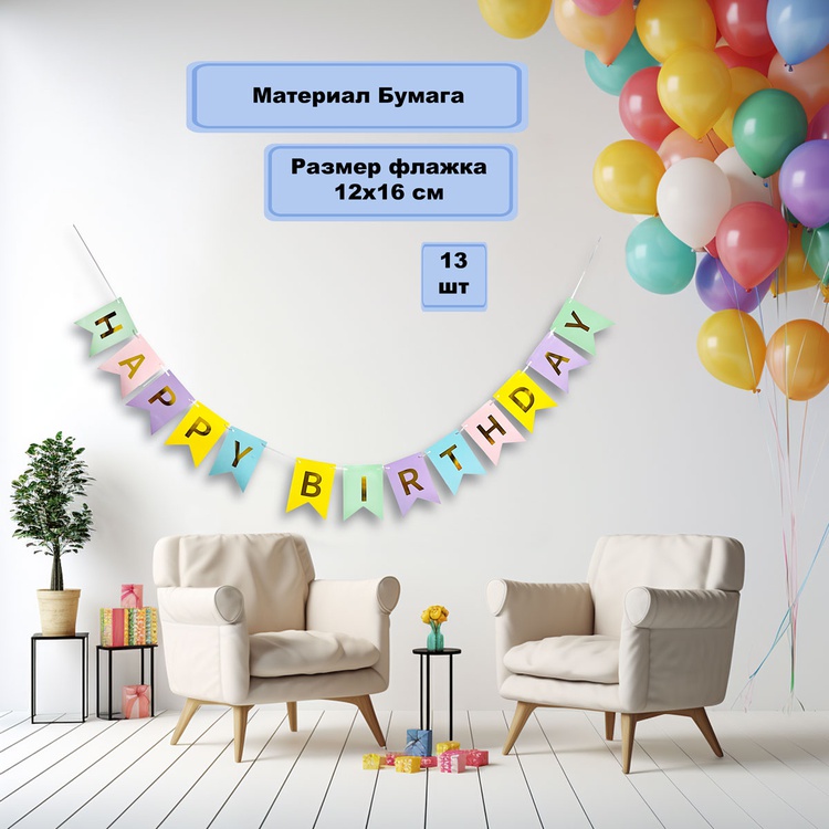 На флажках золотым текстом написано «HAPPY BIRTHDAY».