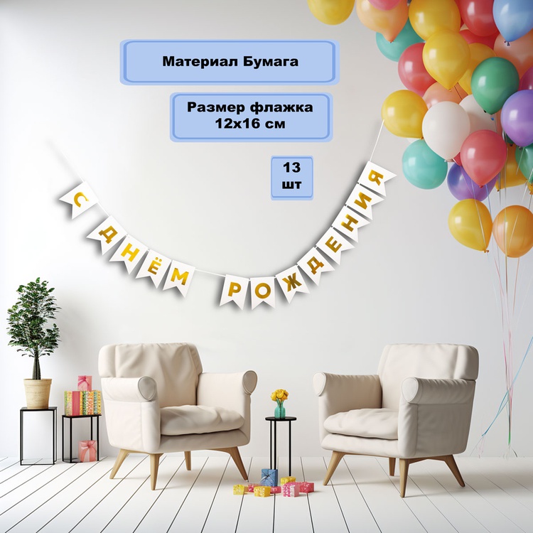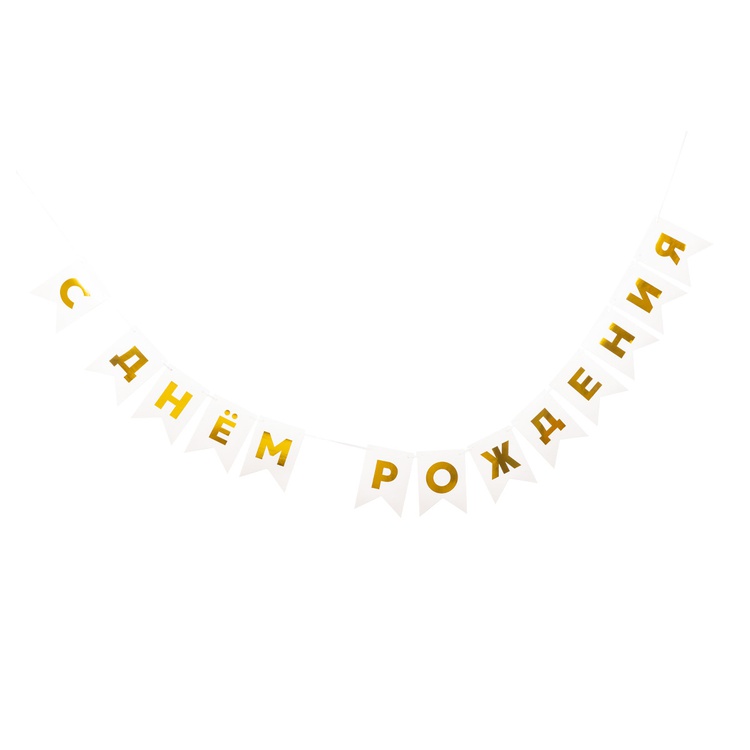 Перетяжка, праздничное украшение интерьера - флажки белого цвета с золотым текстом С ДНЕМ РОЖДЕНИЯ. Поставляется в разобранном виде, что позволяет самостоятельно регулировать длину гирлянды по вашему желанию - в комплекте 13 флажков и лента 500см. Размер одного флажка 12*16см.