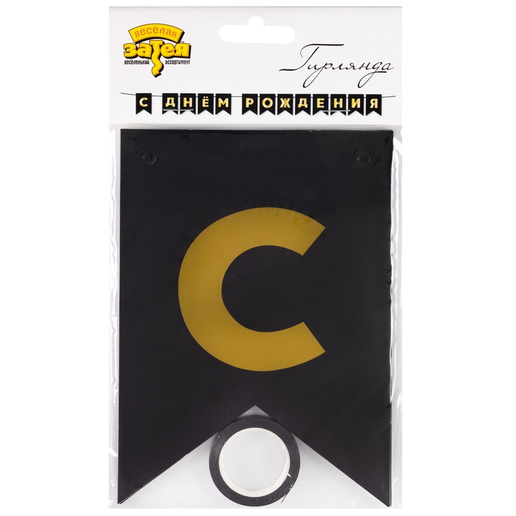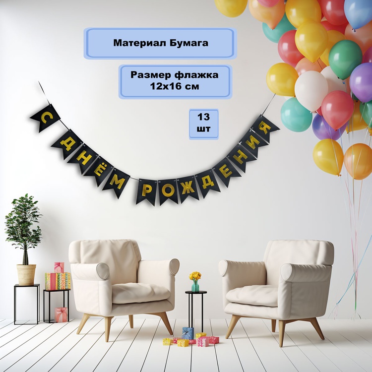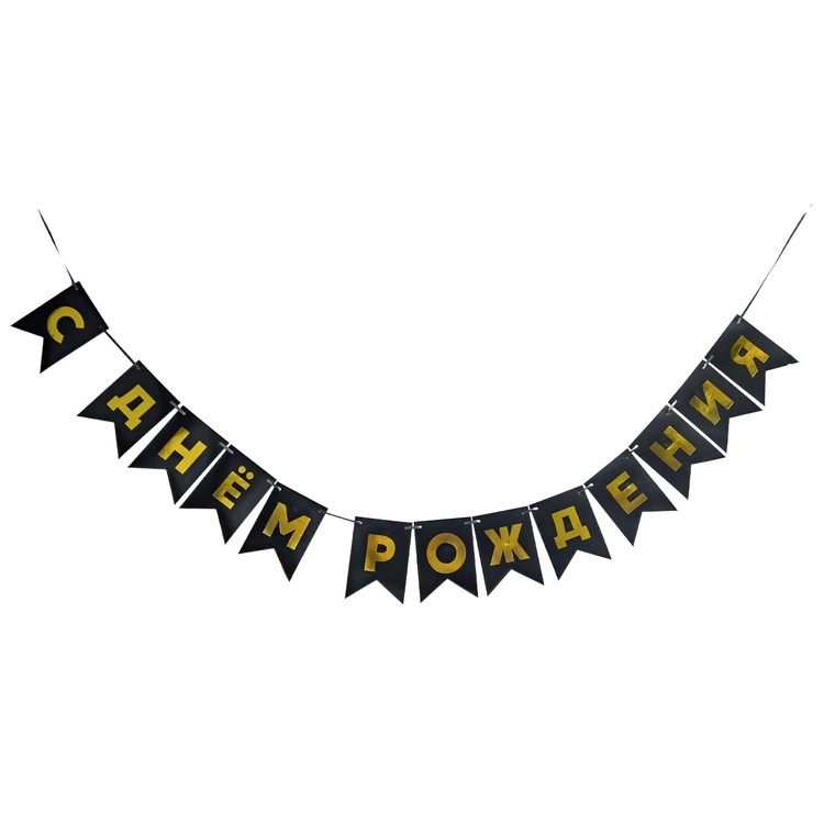 Перетяжка, праздничное украшение интерьера - флажки черного цвета с золотым текстом С ДНЕМ РОЖДЕНИЯ. Поставляется в разобранном виде, что позволяет самостоятельно регулировать длину гирлянды по вашему желанию - в комплекте 13 флажков и лента 500см. Размер одного флажка 12*16см.
