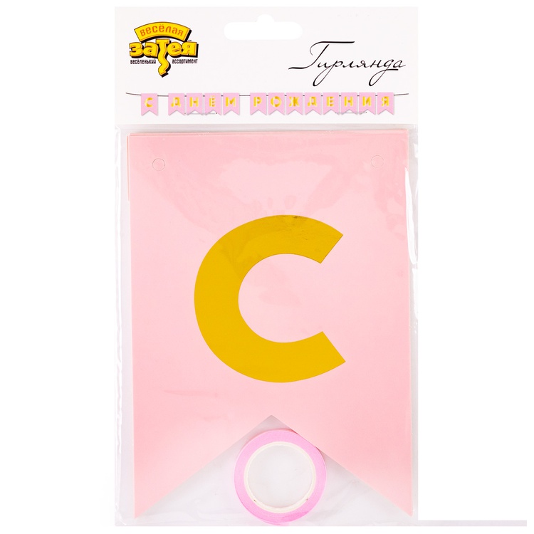 Перетяжка, праздничное украшение интерьера - флажки розового цвета с золотым текстом С ДНЕМ РОЖДЕНИЯ. Поставляется в разобранном виде, что позволяет самостоятельно регулировать длину гирлянды по вашему желанию - в комплекте 13 флажков и лента 500см. Размер одного флажка 12*16см.