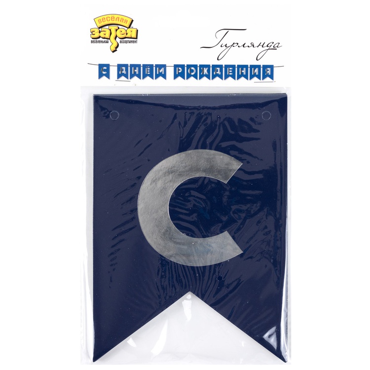 Перетяжка, праздничное украшение интерьера - флажки синего цвета с серебряным текстом С ДНЕМ РОЖДЕНИЯ. Поставляется в разобранном виде, что позволяет самостоятельно регулировать длину гирлянды по вашему желанию - в комплекте 13 флажков и лента 500см. Размер одного флажка 12*16см.