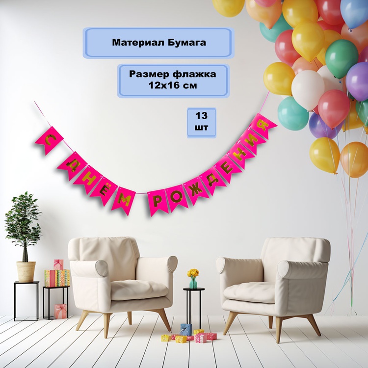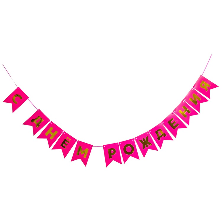 Перетяжка, праздничное украшение интерьера - флажки ярко-розового цвета с золотым текстом С ДНЕМ РОЖДЕНИЯ. Поставляется в разобранном виде, что позволяет самостоятельно регулировать длину гирлянды по вашему желанию - в комплекте 13 флажков и лента 500см. Размер одного флажка 12*16см.