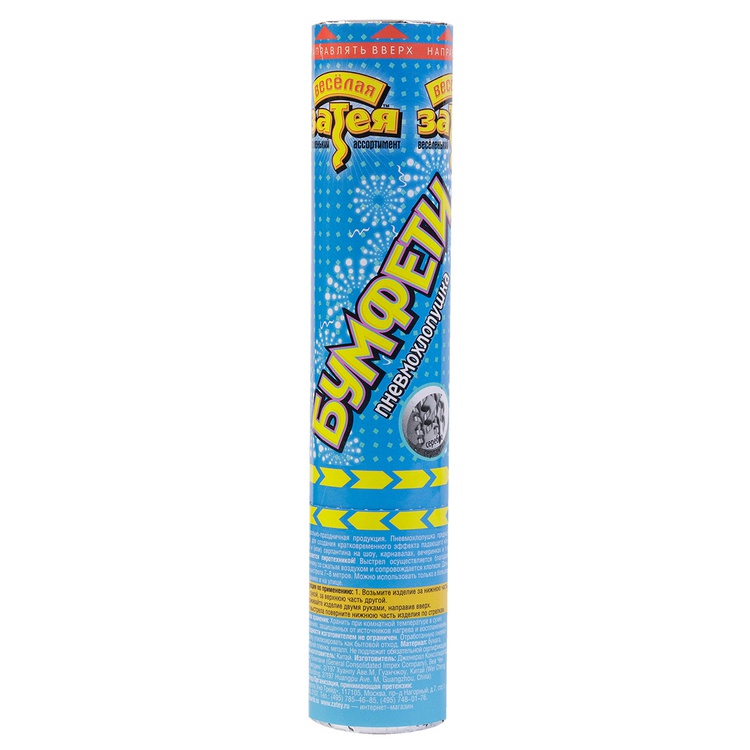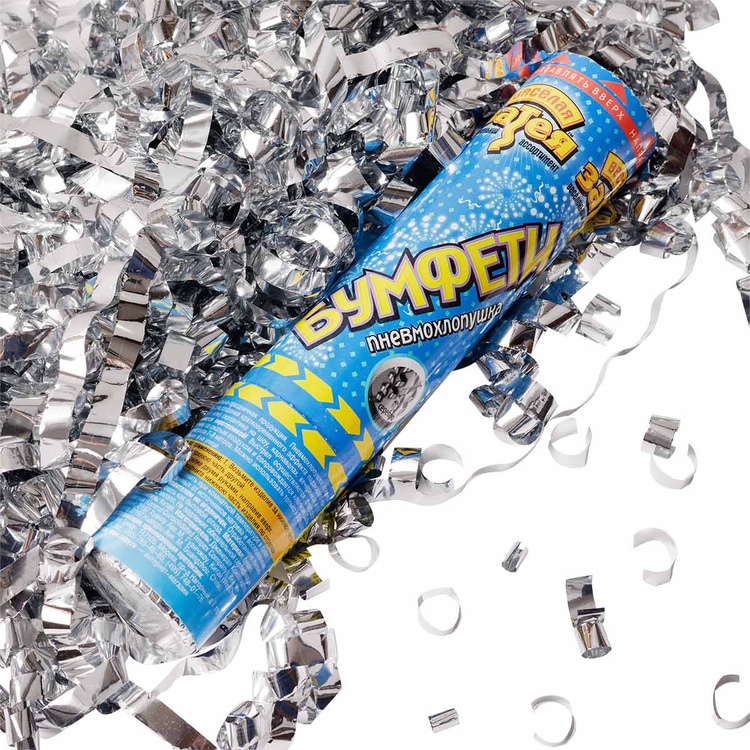 Пневматическое устройство, аналог хлопушки, абсолютно безопасное, предназначено для использования в помещении и на улице, дальность выстрела 6-8 м. Корпус хлопушки состоит из двух частей: пневматического баллона со сжатым воздухом и картонного цилиндра с наполнителем. Баллон изготовлен из металла, надежен и безопасен при хранении и в использовании, обладает высокой прочностью, чтобы выдержать давление воздуха. Наполнитель: фольгированный серпантин серебряного цвета.