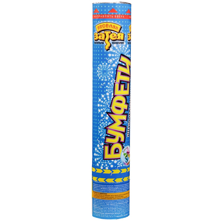 Удерживайте хлопушку двумя руками. Нижнюю часть — пневматический баллон со сжатым воздухом — поверните по часовой стрелке, чтобы произвести «выстрел» конфетти. Высота разлёта наполнения составляет 6–8 метров.