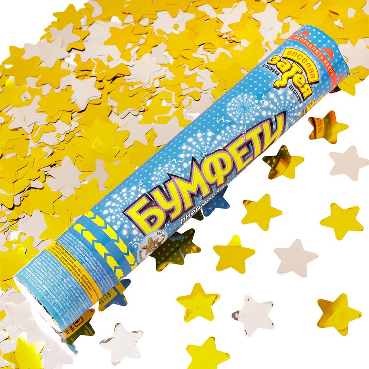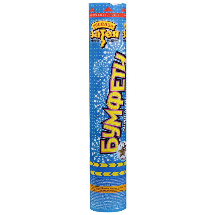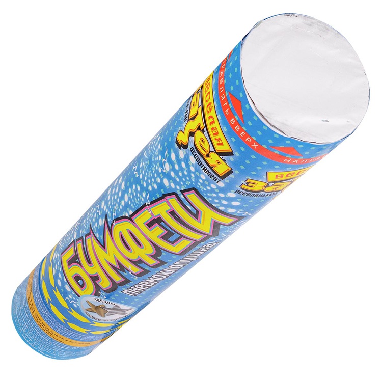 Пневматическое устройство, аналог хлопушки, абсолютно безопасное, предназначено для использования в помещении и на улице, дальность выстрела 6-8 м. Корпус хлопушки состоит из двух частей: пневматического баллона со сжатым воздухом и картонного цилиндра с наполнителем. Баллон изготовлен из металла, надежен и безопасен при хранении и в использовании, обладает высокой прочностью, чтобы выдержать давление воздуха. Выстреливает золотым и серебряным фольгированным конфетти в форме звезд.