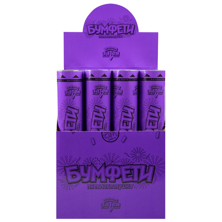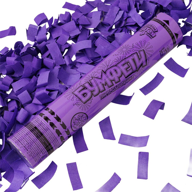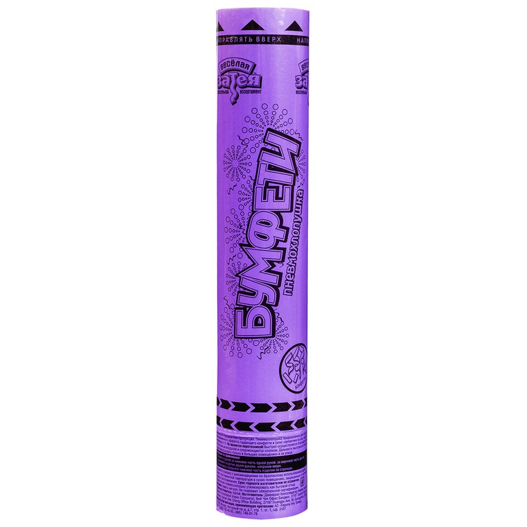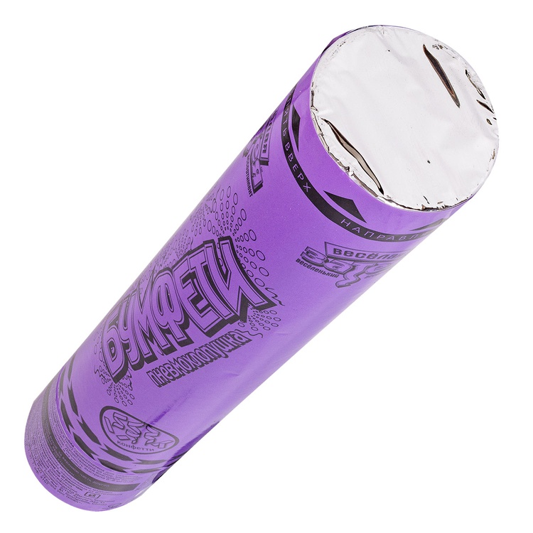 Пневматическое устройство, аналог хлопушки, абсолютно безопасное, предназначено для использования в помещении и на улице, дальность выстрела 6-8 м. Корпус хлопушки состоит из двух частей: пневматического баллона со сжатым воздухом и картонного цилиндра с наполнителем. Баллон изготовлен из металла, надежен и безопасен при хранении и в использовании, обладает высокой прочностью, чтобы выдержать давление воздуха. Выстреливает прямоугольное конфетти и серпантин из фиолетовой бумаги.