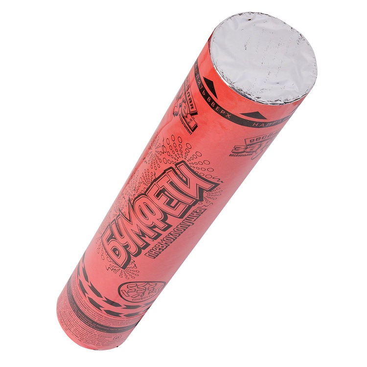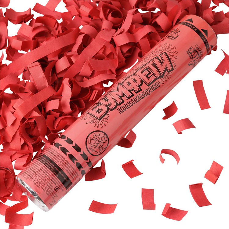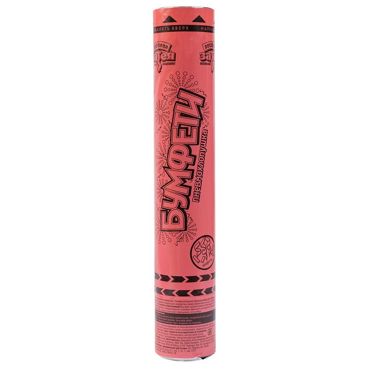 Пневматическое устройство, аналог хлопушки, абсолютно безопасное, предназначено для использования в помещении и на улице, дальность выстрела 6-8 м. Корпус хлопушки состоит из двух частей: пневматического баллона со сжатым воздухом и картонного цилиндра с наполнителем. Баллон изготовлен из металла, надежен и безопасен при хранении и в использовании, обладает высокой прочностью, чтобы выдержать давление воздуха. Выстреливает прямоугольное конфетти и серпантин из красной бумаги.