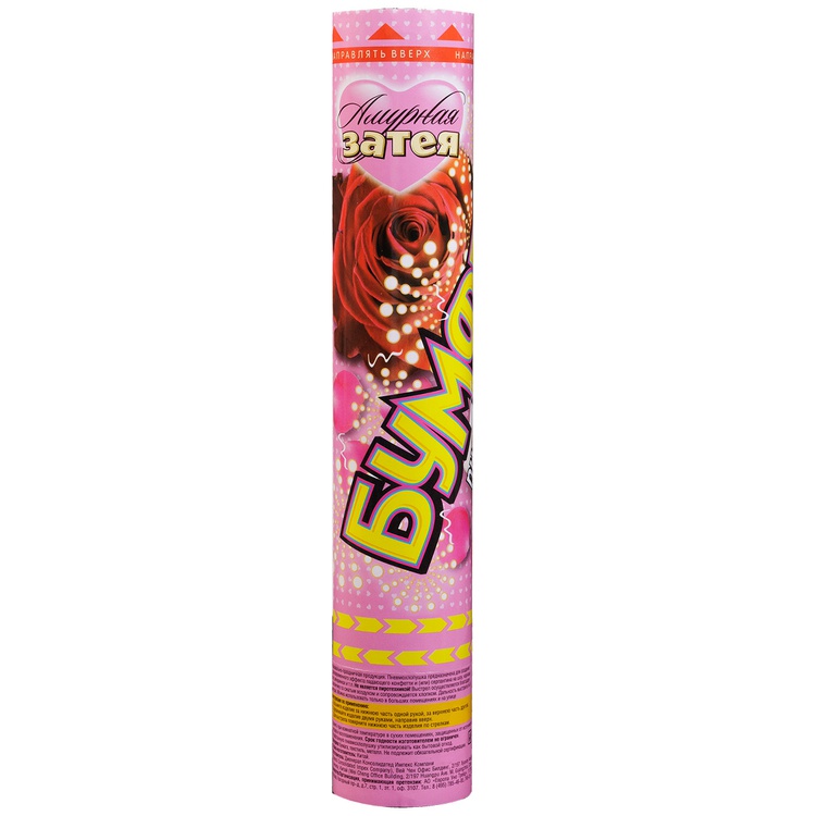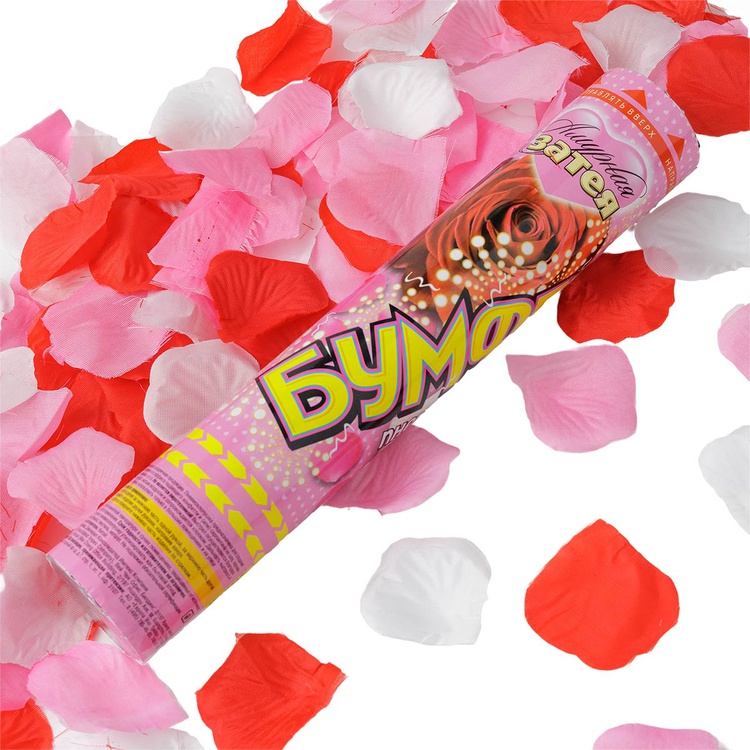 Пневматическое устройство, аналог хлопушки, абсолютно безопасное, предназначено для использования в помещении и на улице, дальность выстрела 5-7 м. Корпус хлопушки состоит из двух частей: пневматического баллона со сжатым воздухом и картонного цилиндра с наполнителем. Баллон изготовлен из металла, надежен и безопасен при хранении и в использовании, обладает высокой прочностью, чтобы выдержать давление воздуха. Выстреливает тканевыми лепестками розовых, белых и красных роз.