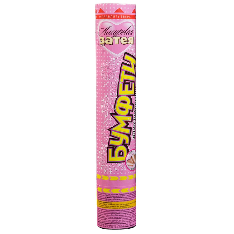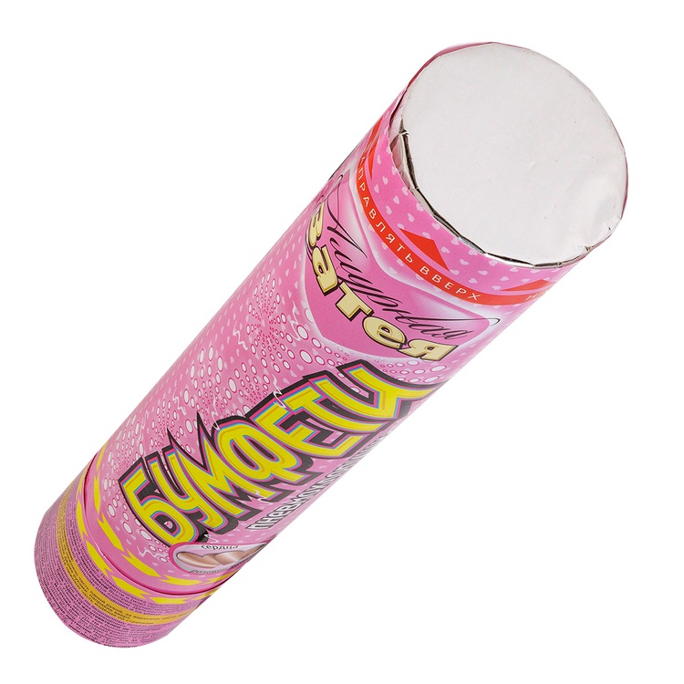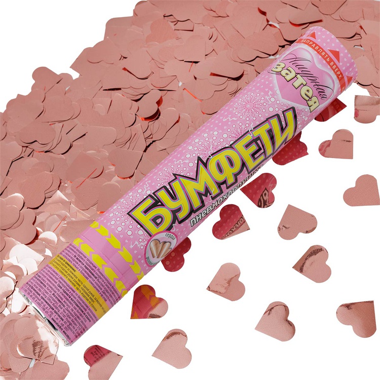 Пневматическое устройство, аналог хлопушки, абсолютно безопасное, предназначено для использования в помещении и на улице, дальность выстрела 6-8 м. Корпус хлопушки состоит из двух частей: пневматического баллона со сжатым воздухом и картонного цилиндра с наполнителем. Баллон изготовлен из металла, надежен и безопасен при хранении и в использовании, обладает высокой прочностью, чтобы выдержать давление воздуха. Выстреливает фольгированным конфетти в форме сердец цвета розовое золото.