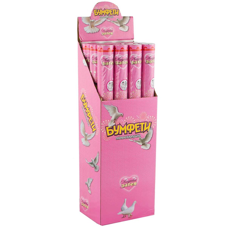 Пневматическое устройство, аналог хлопушки, абсолютно безопасное, предназначено для использования в помещении и на улице, дальность выстрела 6-8 м. Корпус хлопушки состоит из двух частей: пневматического баллона со сжатым воздухом и картонного цилиндра с наполнителем. Баллон изготовлен из металла, надежен и безопасен при хранении и в использовании, обладает высокой прочностью, чтобы выдержать давление воздуха. Выстреливает конфетти из бумаги и фольги в виде белых голубей.