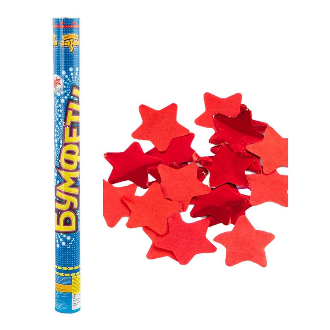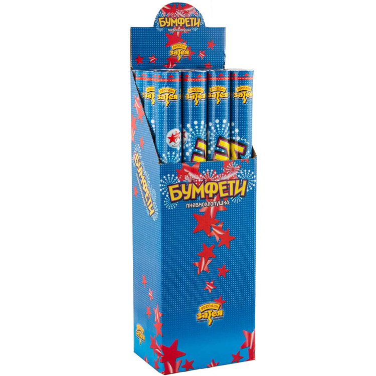Пневматическая хлопушка — это устройство, которое выстреливает конфетти в виде красных звёздочек из бумаги и фольги. Предназначено для использования как в помещении, так и на улице.