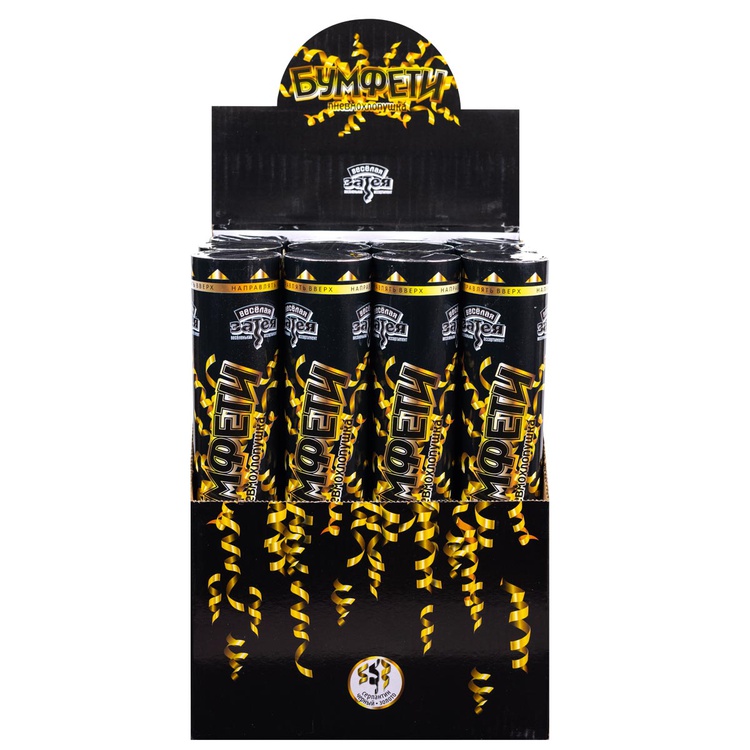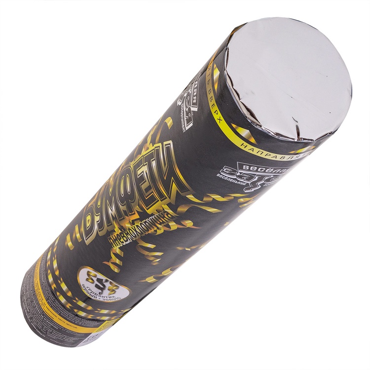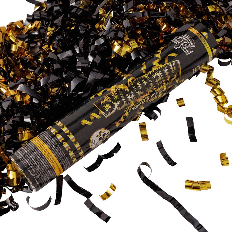 Пневматическое устройство, аналог хлопушки, абсолютно безопасное, предназначено для использования в помещении и на улице, дальность выстрела 6-8 м. Корпус хлопушки состоит из двух частей: пневматического баллона со сжатым воздухом и картонного цилиндра с наполнителем. Баллон изготовлен из металла, надежен и безопасен при хранении и в использовании, обладает высокой прочностью, чтобы выдержать давление воздуха. Выстреливает фольгированным черным/золотым серпантином.