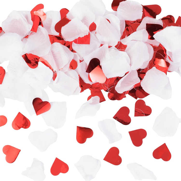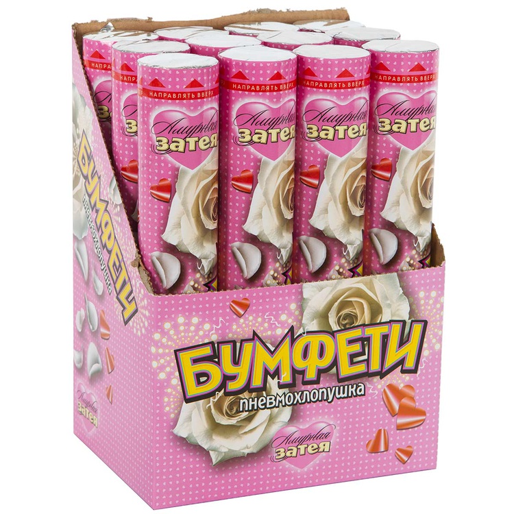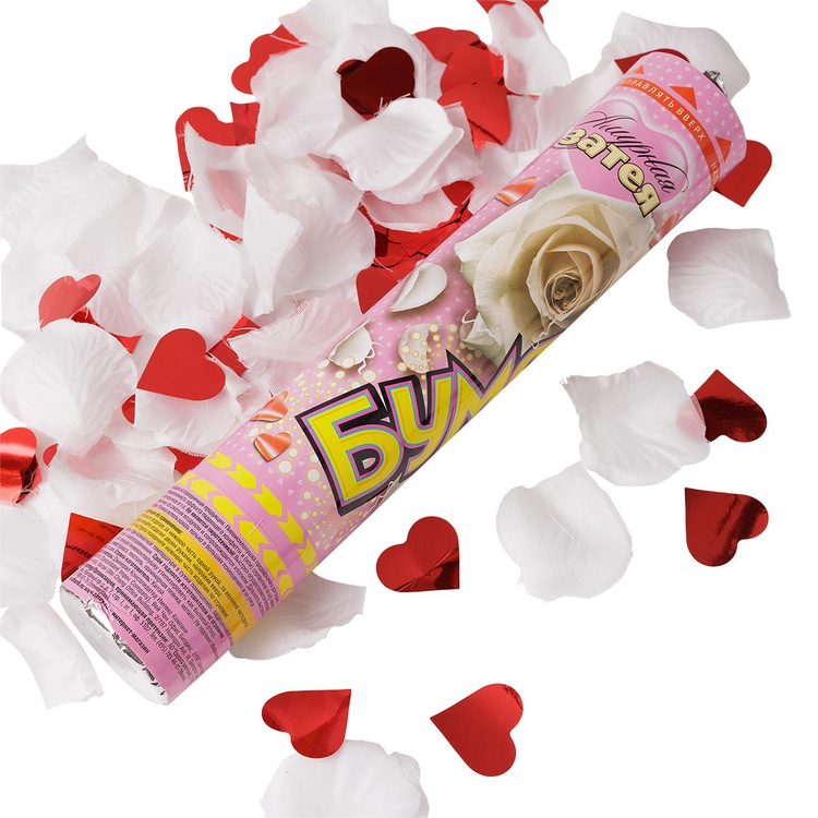 Пневмохлопушка с белыми лепестками роз и красными сердцами — эффектный акцент для любого торжества