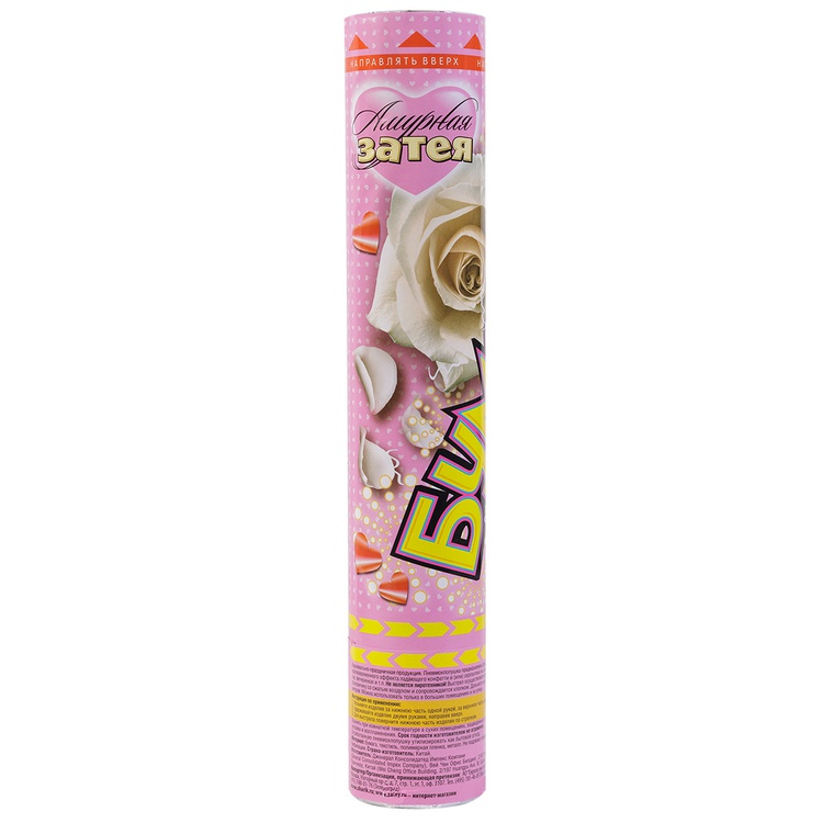 Удерживайте хлопушку двумя руками. Нижнюю часть — пневматический баллон со сжатым воздухом — поверните по часовой стрелке, чтобы произвести «выстрел» конфетти. Высота разлёта наполнения составляет 4–7 метров.