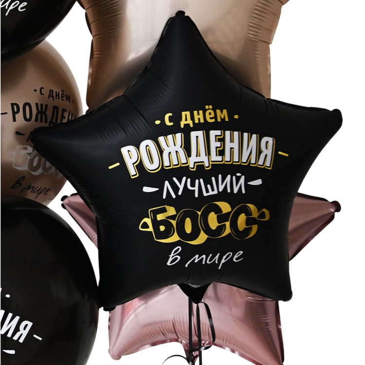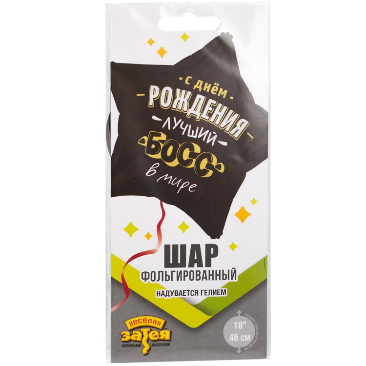 фольгированный шар размером 18"/ 46см в форме звезды с оригинальным дизайном - отличный способ поздравить лучшего босса с днем рождения. Шар изготовлен из качественных материалов (полимерная фольгированная пленка). Основной фон шара плотного, черного цвета с матовым эффектом,а некоторые элементы в дизайне - блестящего, металлизированного золотого оттенка. Внимание! Реальный цвет товара может незначительно отличаться от представленного на фотографии в зависимости от настроек вашего монитора.