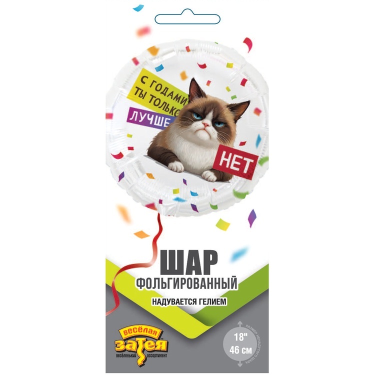 Объемный шар из фольги с оригинальным принтом «Кот Сердитый» с надписью «С годами ты только лучше. Нет.» станет ярким акцентом праздника и необычным подарком.