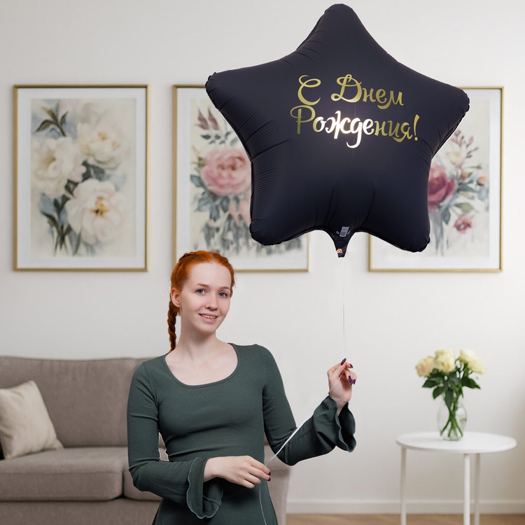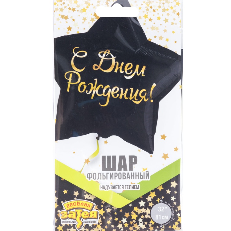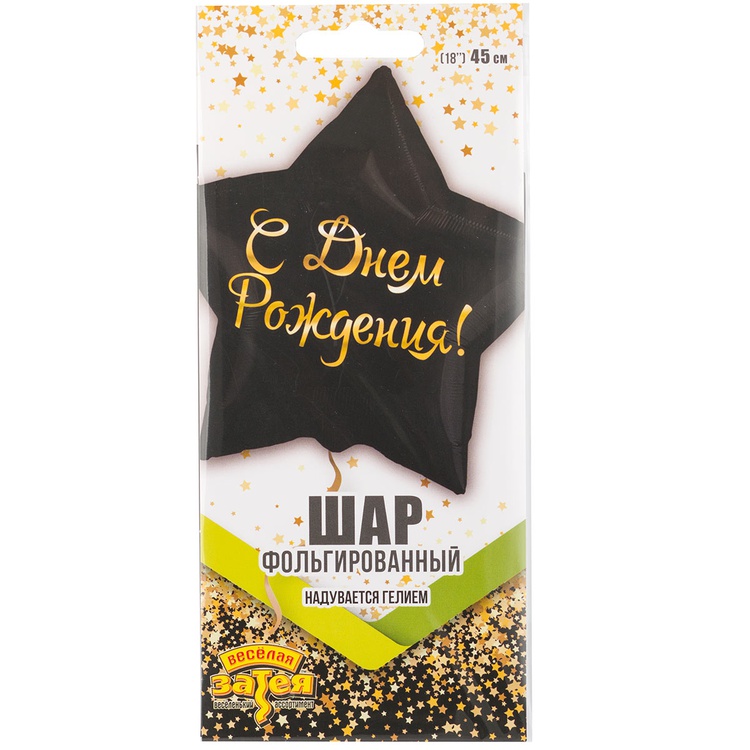 Фольгированный шар-звезда размером 18"/ 46см с оригинальным текстовым дизайном. Шар изготовлен из тонкой миларовой пленки (фольга на полиэтиленовой основе). Основной фон шара плотного, черного цвета с матовым эффектом,а надпись в дизайне - блестящего, металлизированного золотого цвета. Шар имеет встроенный клапан, что упрощает надувание. Внимание! Реальный цвет товара может незначительно отличаться от представленного на фотографии в зависимости от настроек вашего монитора.