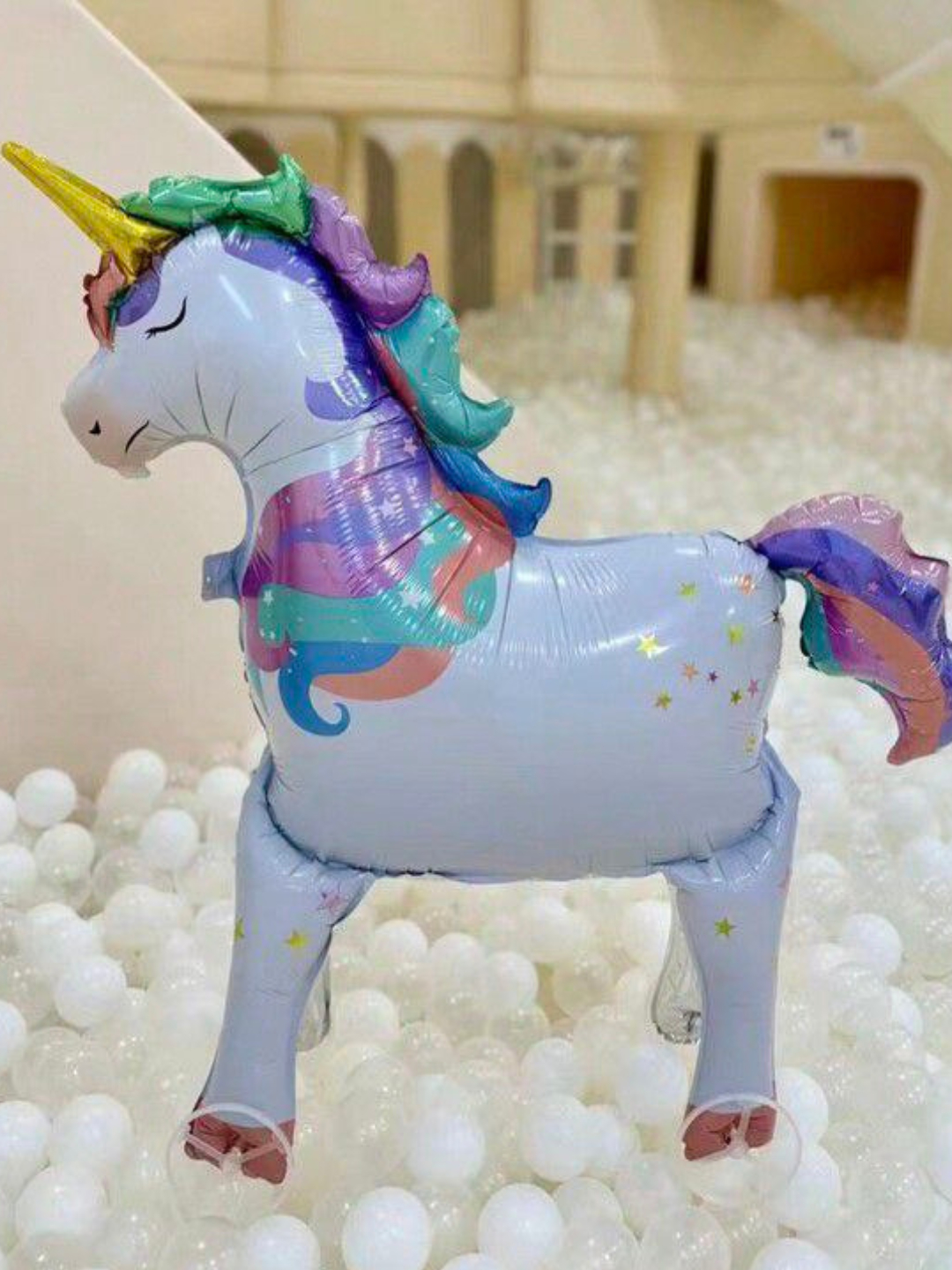 Фольгированная фигура в виде единорога на колесиках — это милый и стильный элемент для детских праздников, дней рождения и фотозон.