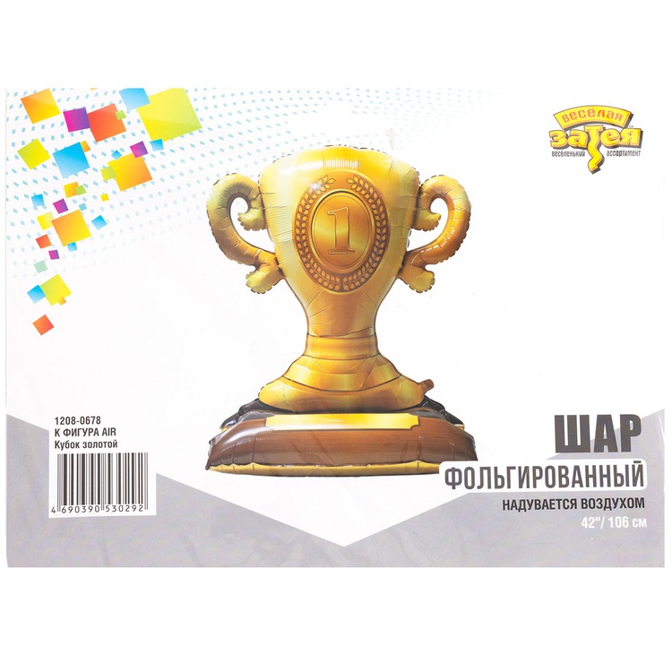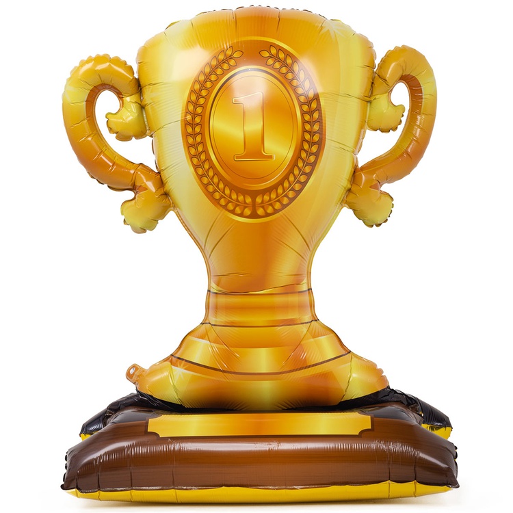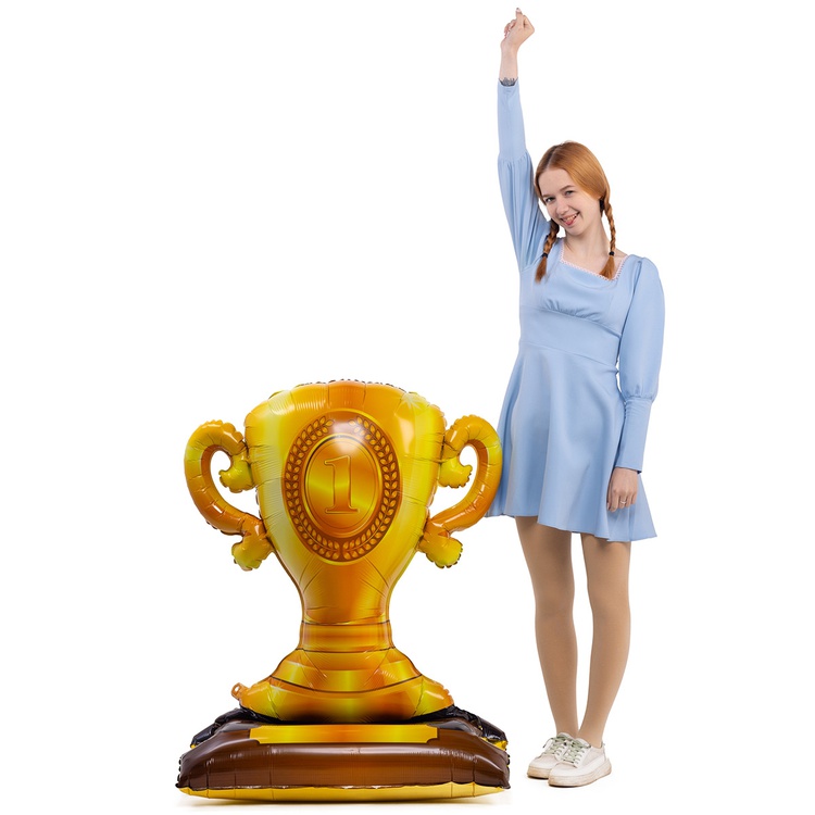 Объемный фольгированный шар высотой 106 см в форме большого золотого кубка с цифрой "1". Данный шар представляет собой цельную фольгированную фигуру, которая надувается полностью через один клапан, находящийся сбоку, вместе с основной частью сразу же надуется и нижняя часть в виде подставки. Такую фигуру можно использовать как самостоятельную декорацию для любого праздника. Шар надувается ВОЗДУХОМ. Тонкая миларовая пленка (фольга на полиэтиленовой основе) позволяет шарам не сдуваться от недели до одного месяца. Упакован в красочный пакет, с цветным изображением шара, что позволяет выставлять товар в не надутом виде.