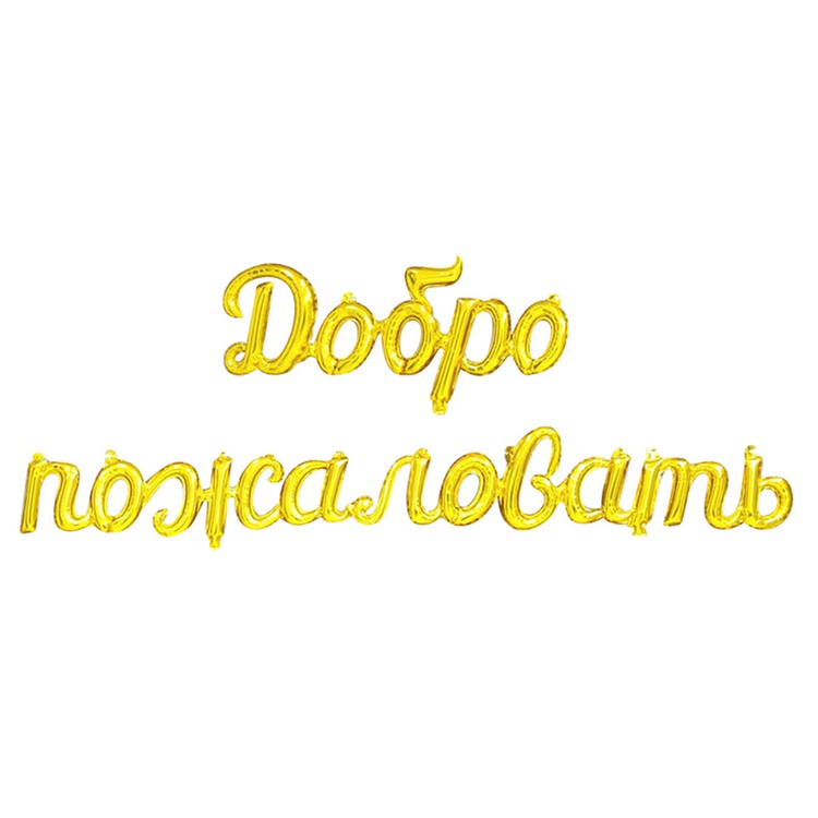 Фраза "ДОБРО ПОЖАЛОВАТЬ", изготовленная из полимерной фольгированной плёнки. Текст фразы состоит из трёх частей. Каждая часть содержит клапан и хвостики для подвешивания с отверстиями. Инструкция: 1) надуть каждую деталь воздухом с помощью входящей в комплект трубочки; 2) части соединить в слово при помощи клейких элементов (входят в комплект); 3) надутые элементы собрать в фразу при помощью входящей в комплект ленты. Размер грилянды в надутом виде с пробелами между слов 275см.