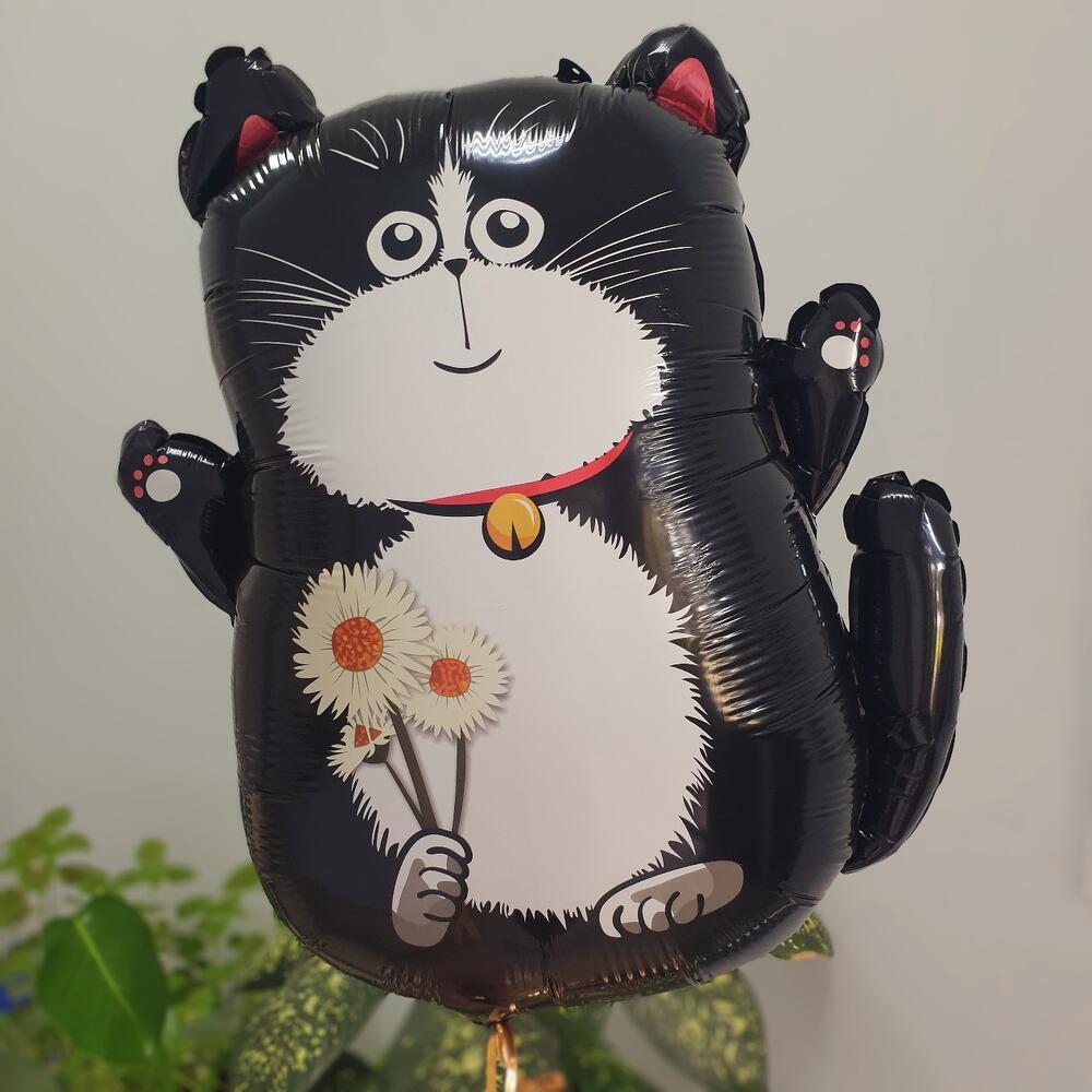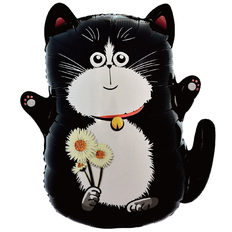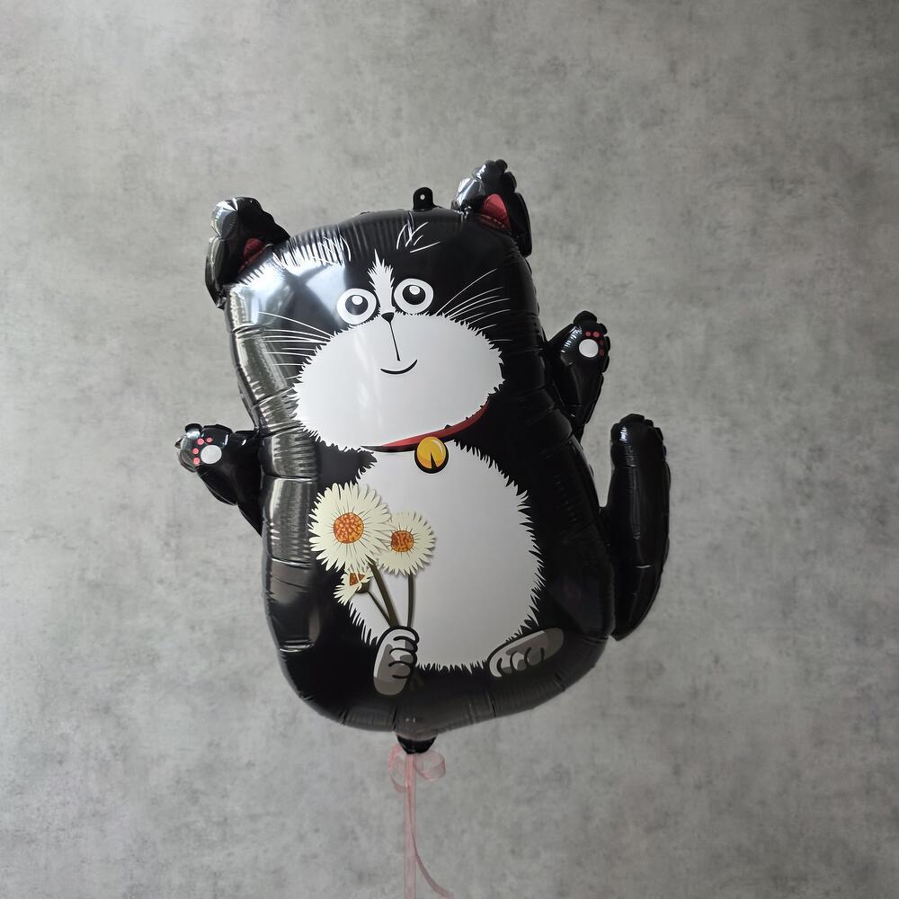Очаровательная фольгированная фигура в виде черного кота с букетом ромашек — нежный и стильный акцент для детских праздников, дней рождения и фотозон.
