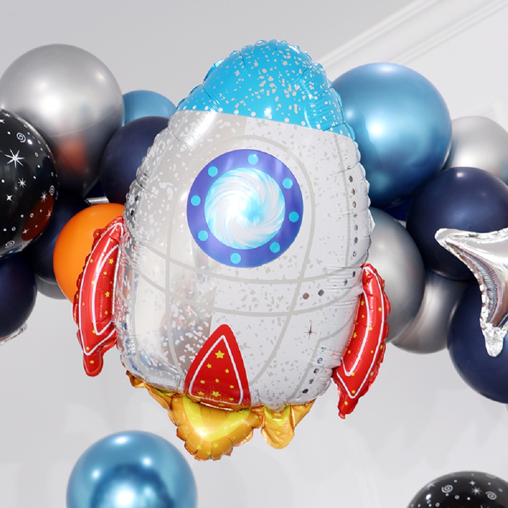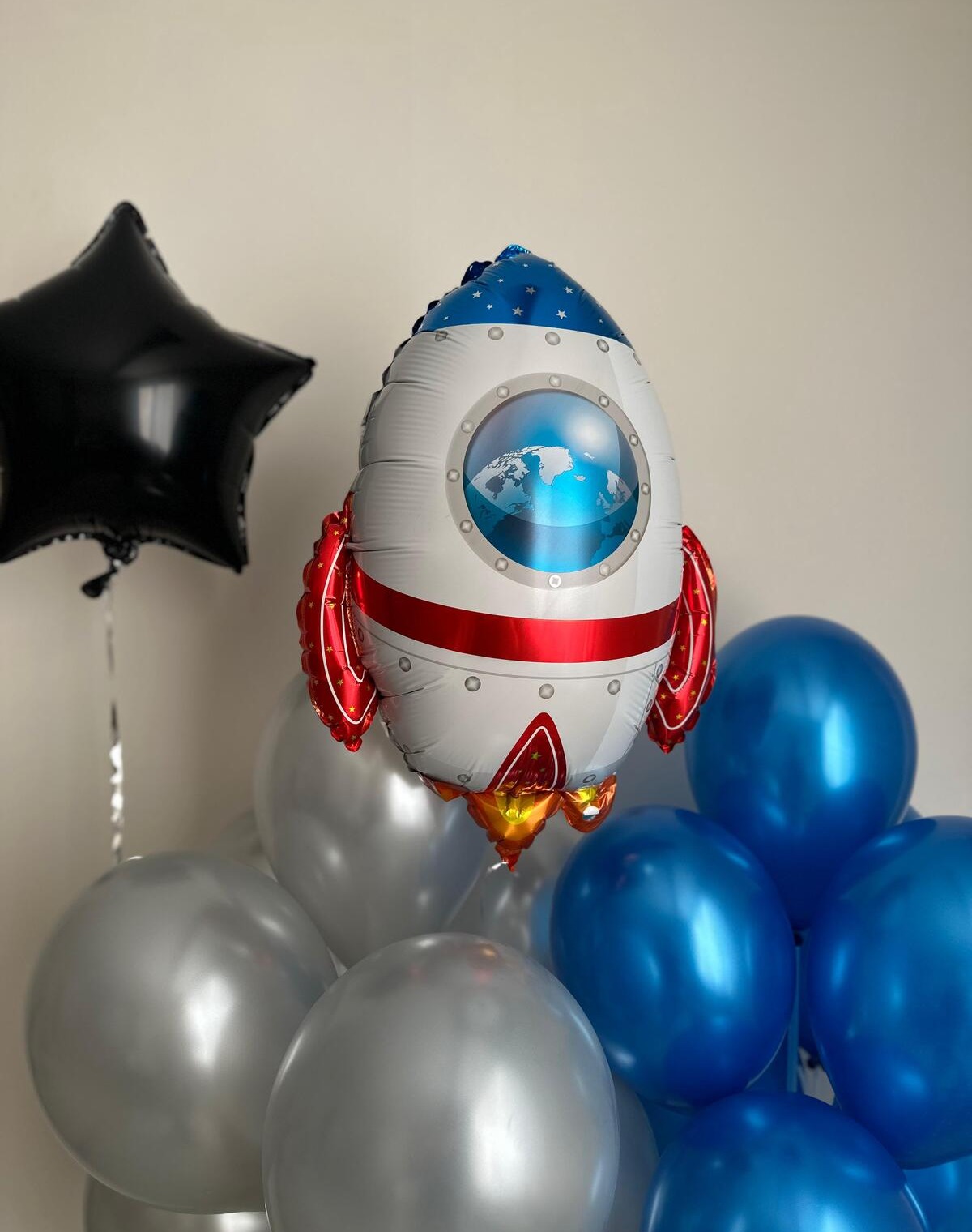 Объемный шар в виде ракеты станет эффектным украшением праздника или оригинальным подарком.