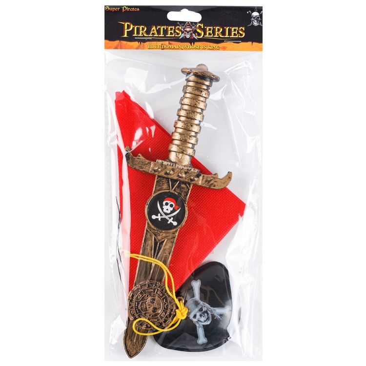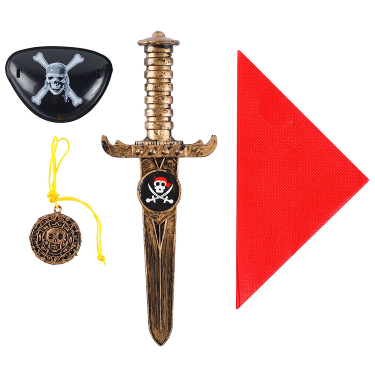 В детский комплект ПИРАТ входят 4 предмета: красная бандана, нож с пиратской символикой, наглазник и кулон.