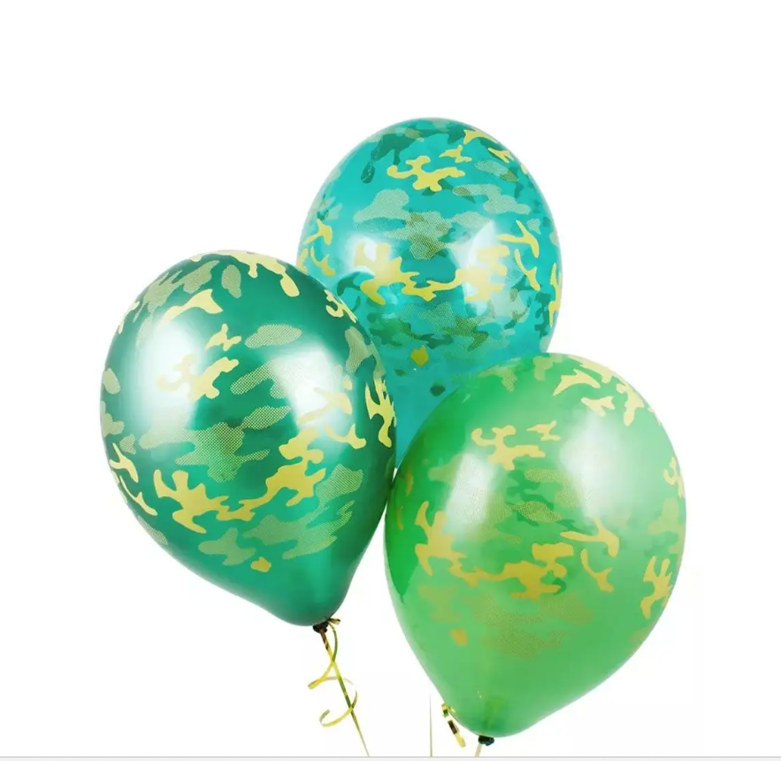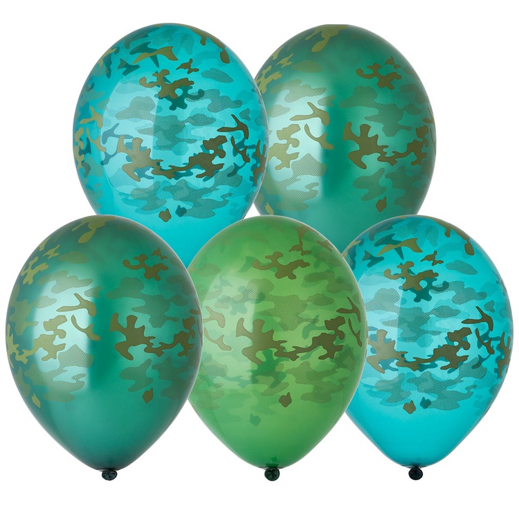 Воздушный шар из натурального латекса, ассорти зелёного цвета с рисунком в виде камуфляжа.