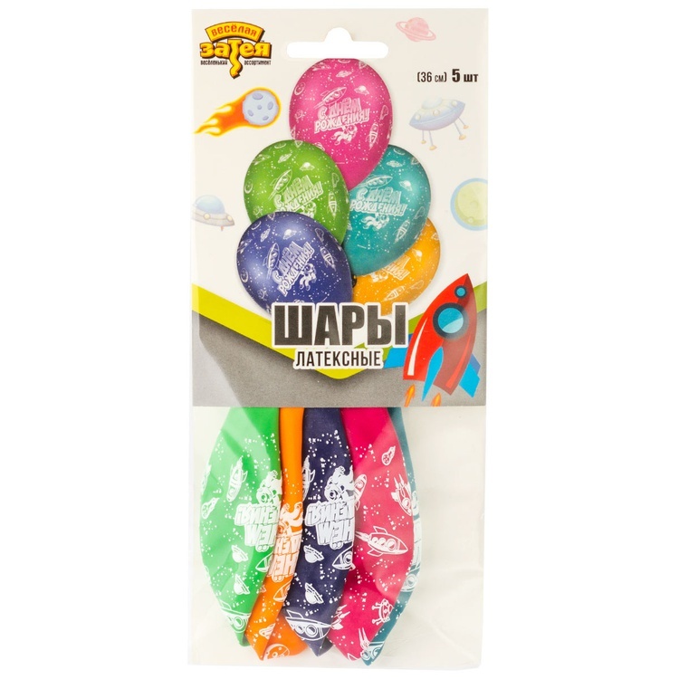 Каждый шар диаметром 36 см, легко надувается воздухом или гелием. В набор входит 5 шаров разного дизайна.