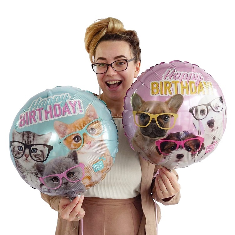 Объёмный фольгированный шар с праздничной надписью и изображением забавных щенков в очках станет стильным украшением торжества. Яркие детали и аккуратный дизайн создают атмосферу радости и изысканности.