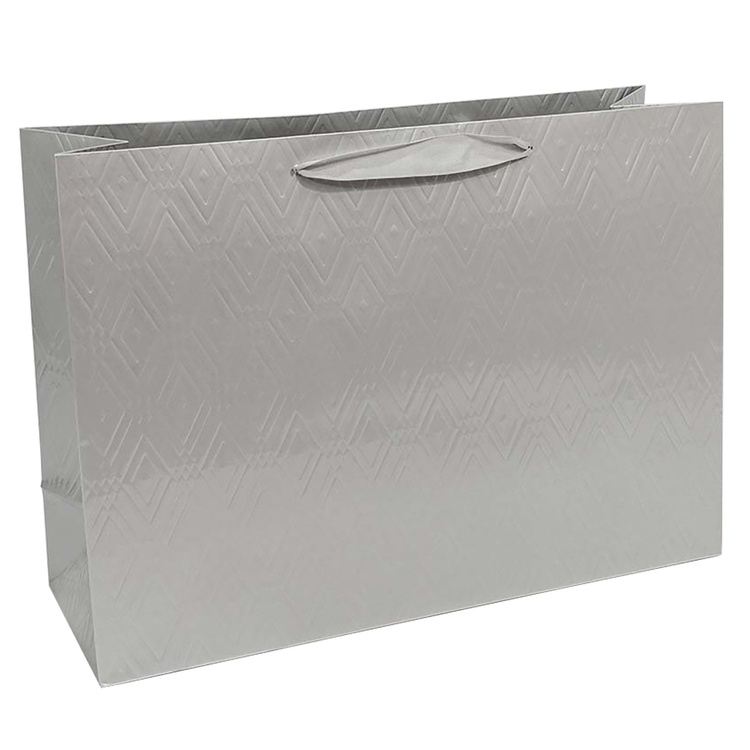 Горизонтальный фактурный однотонный подарочный пакет-сумка. Серебряного цвета. Плотность пакета 230 г/м2.
