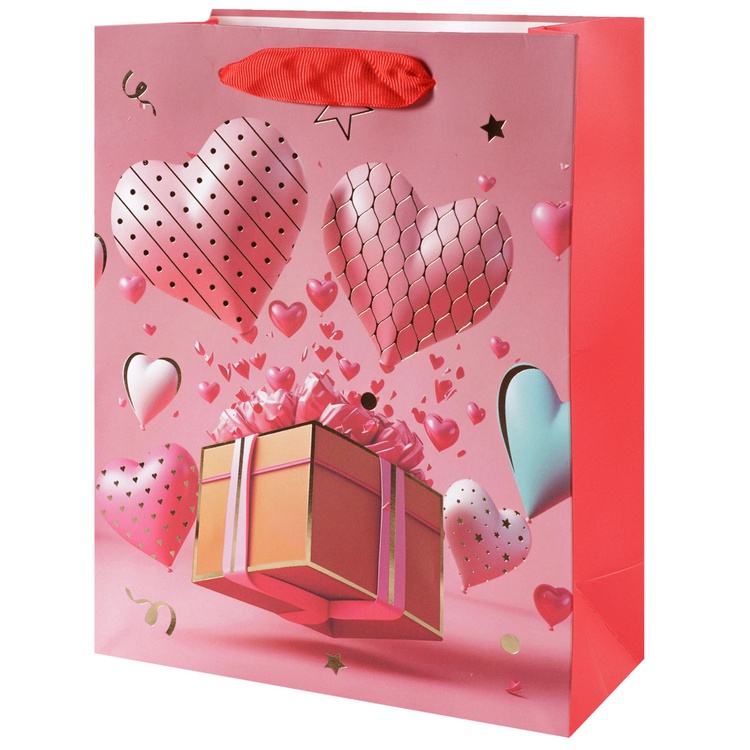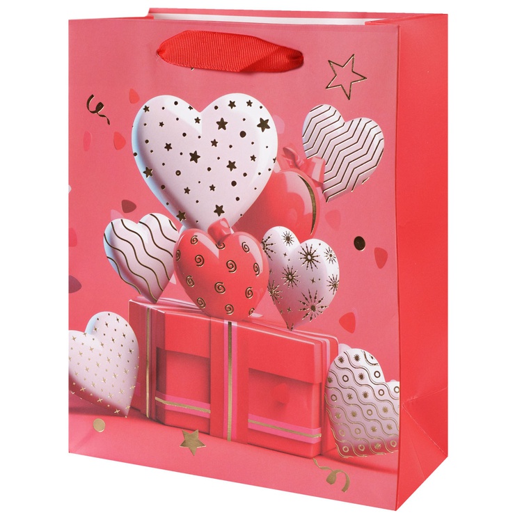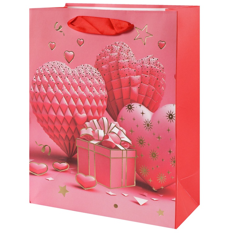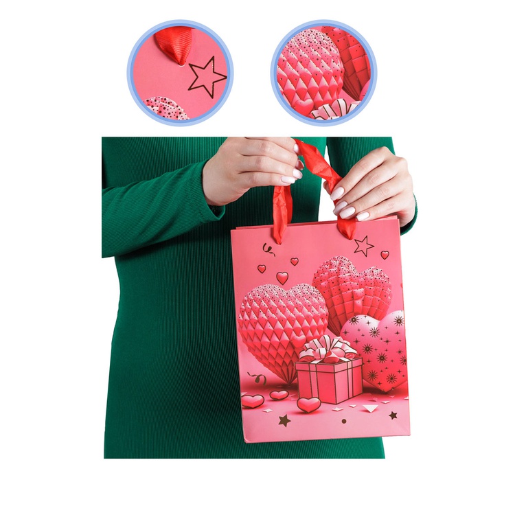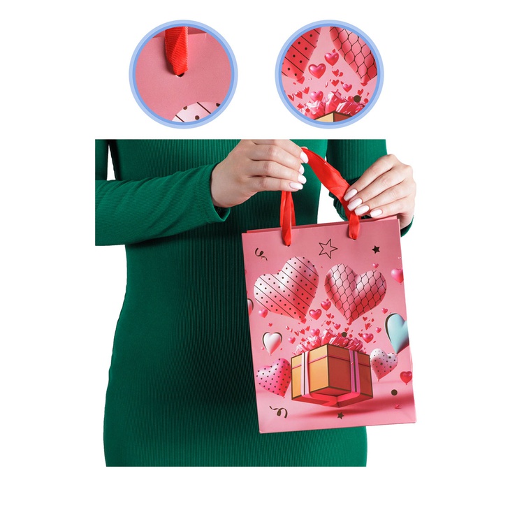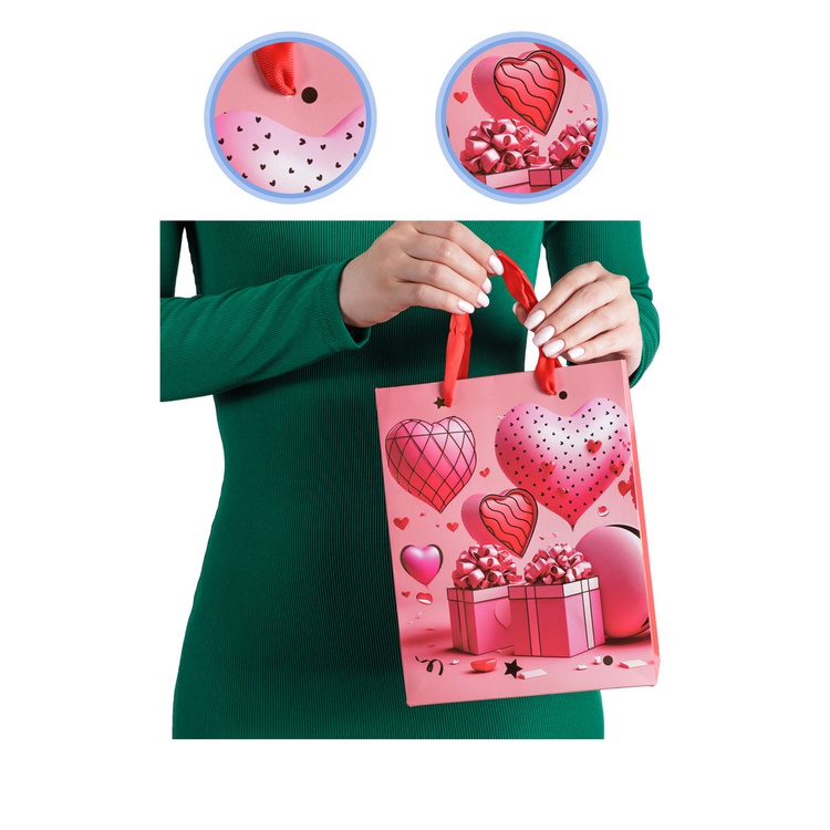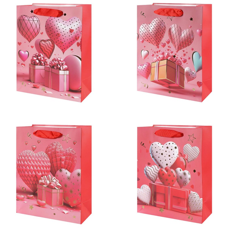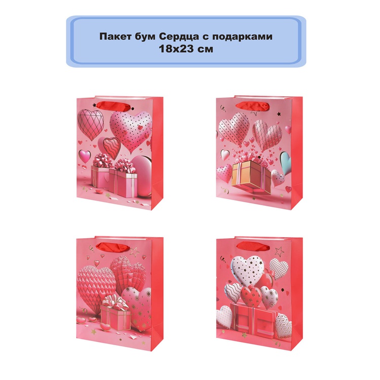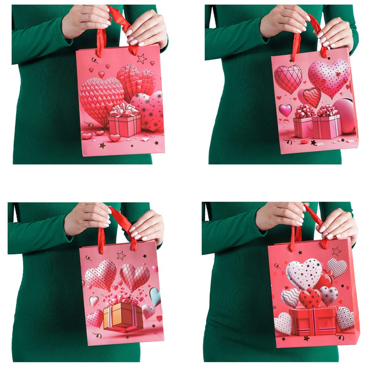 В блоке представлены 4 разных дизайна с изображением сердец и подарков. Пакеты выполнены из плотной бумаги (210 г/м²), что обеспечивает их надёжность и привлекательный внешний вид.