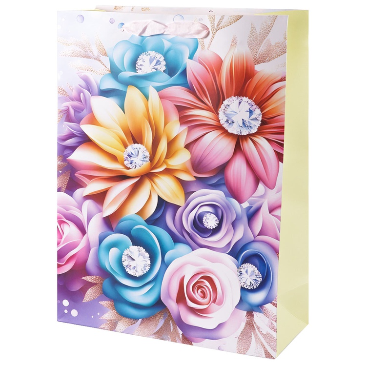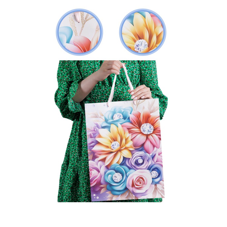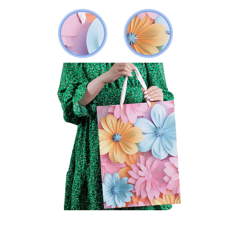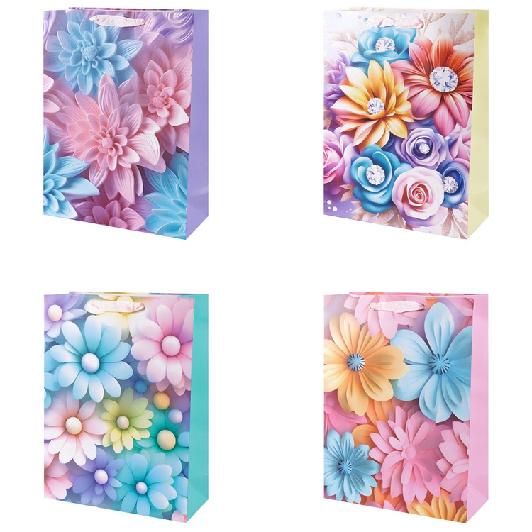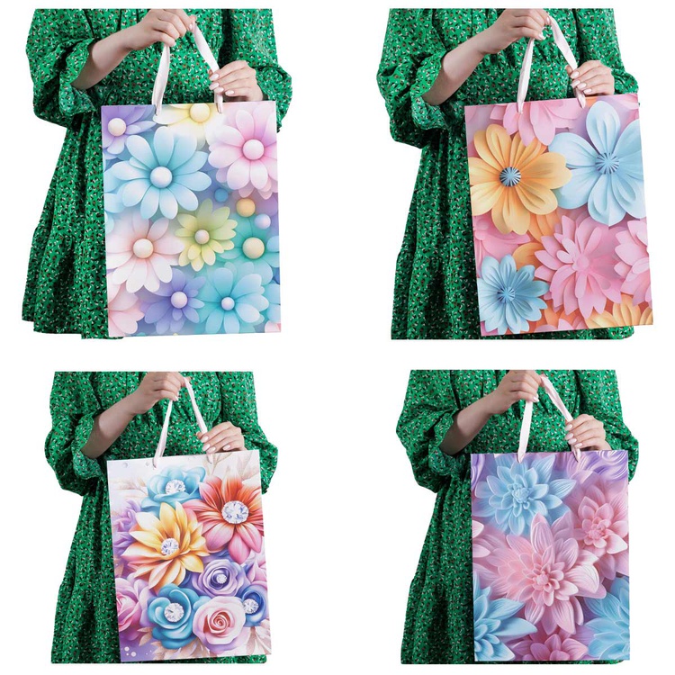 В блоке представлены 4 разных дизайна с изображением цветов . Пакеты выполнены из плотной бумаги (210 г/м²), что обеспечивает их надёжность и привлекательный внешний вид.