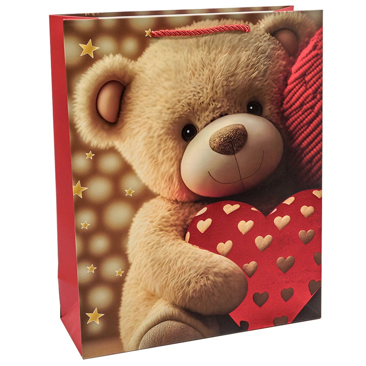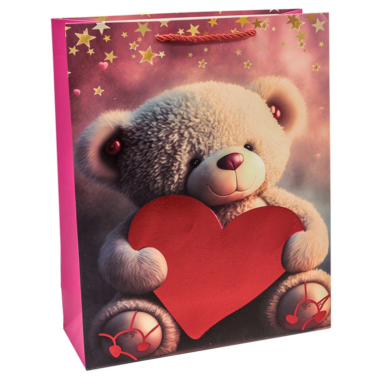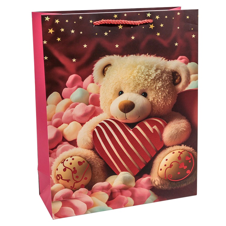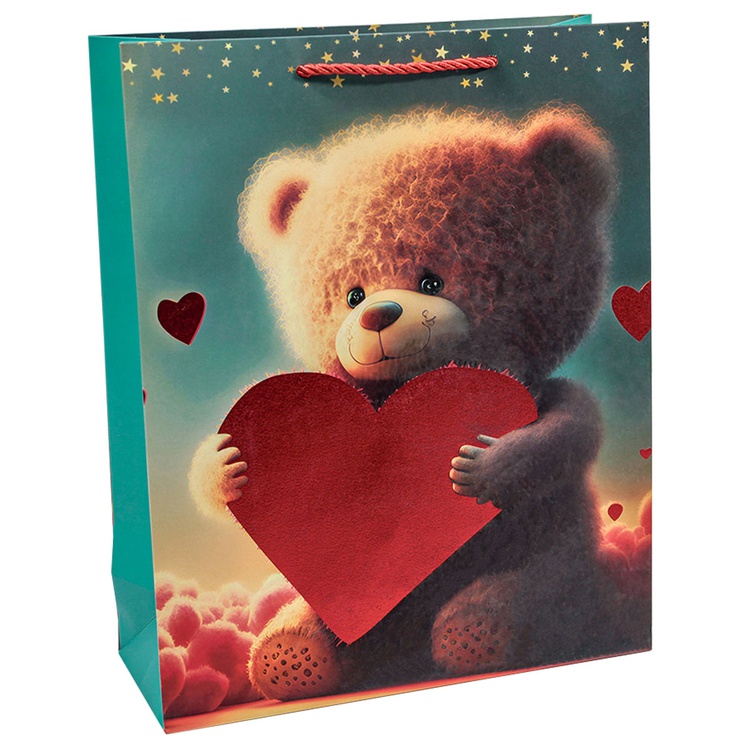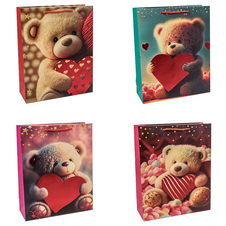 В блоке представлены 4 разных дизайна с изображением сердец и плюшевых мишек. Пакеты выполнены из плотной бумаги (210 г/м²), что обеспечивает их надёжность и привлекательный внешний вид.