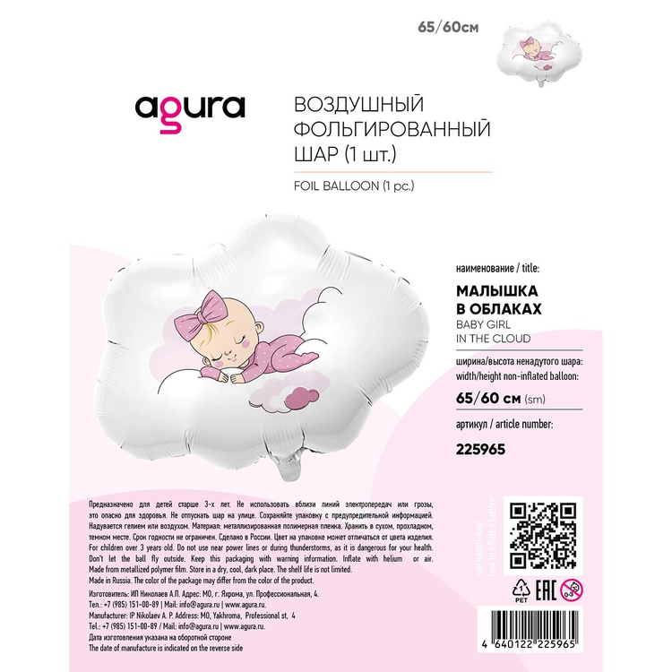 Фольгированный шар с изображением девочки на облачке— идеальный выбор для празднования рождения дочери. Этот шар станет ярким и запоминающимся элементом декора, возвещая о появлении в доме прекрасной малышки.