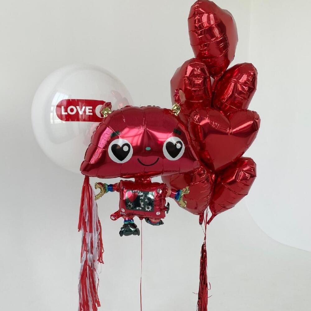 Фольгированный шар-фигура «Влюбленный робот» — это милый воздушный шар, выполненный из качественной полимерной плёнки. Он станет ярким и запоминающимся элементом для любого праздника.