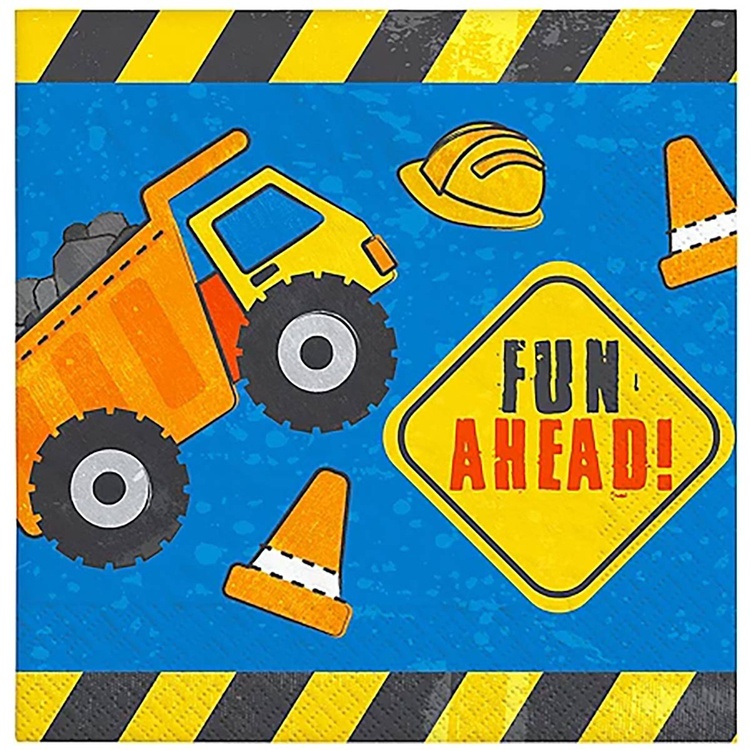 Набор качественных бумажных салфеток с рисунком строительной техники создаёт атмосферу заботливо продуманного праздника.