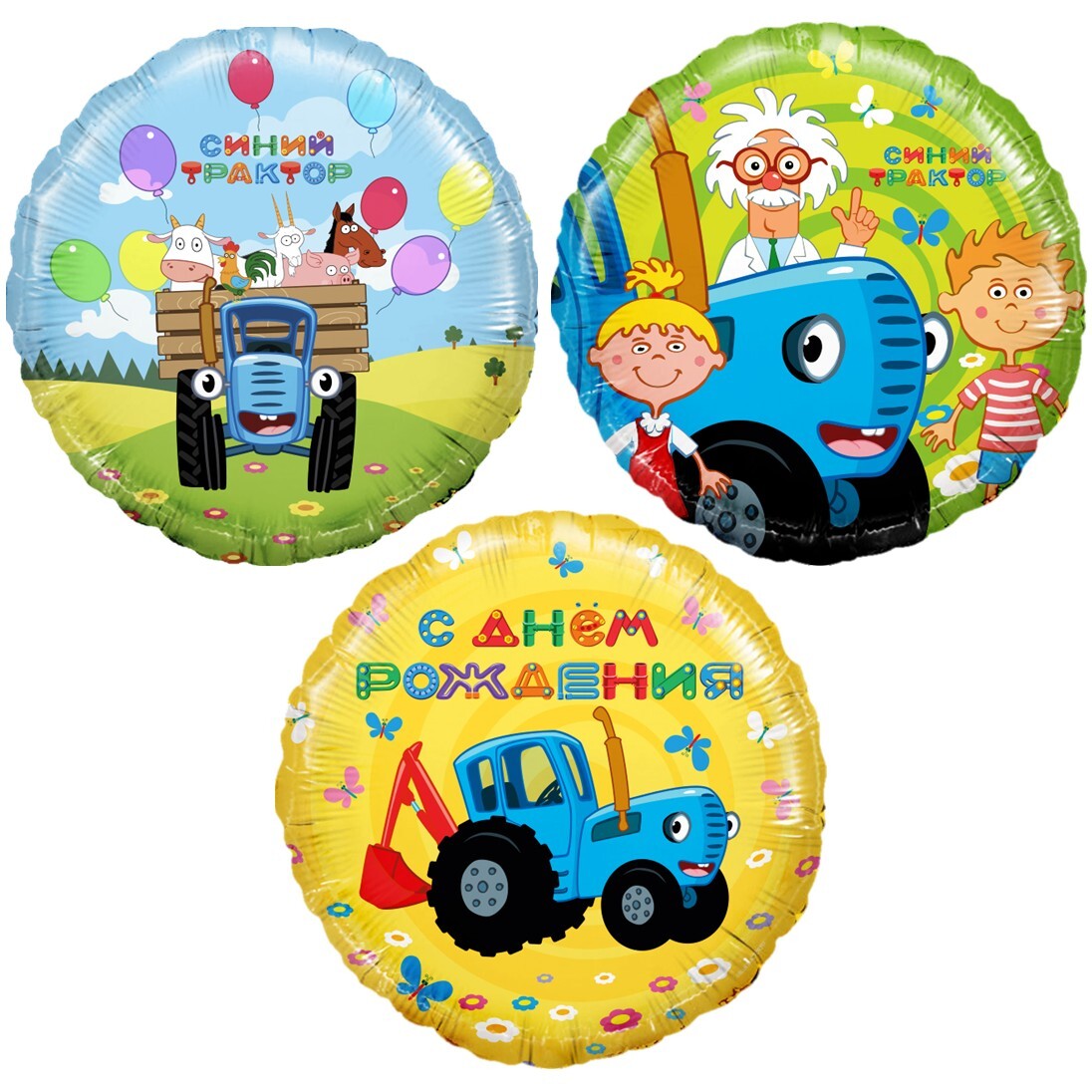 Объёмный шар с надписью и любимыми героями мультфильма «Синий трактор» станет ярким акцентом праздничного стола или стильным элементом фотозоны.