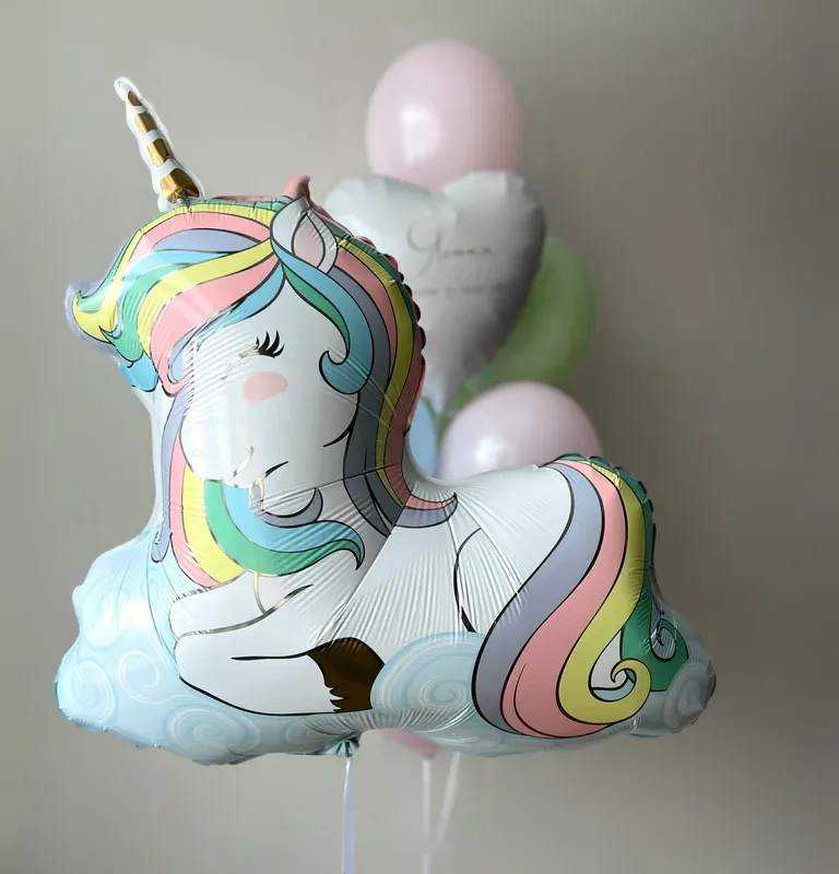 Фольгированная фигура в виде нежного единорога — это милый и стильный элемент для детских праздников, дней рождения и фотозон.