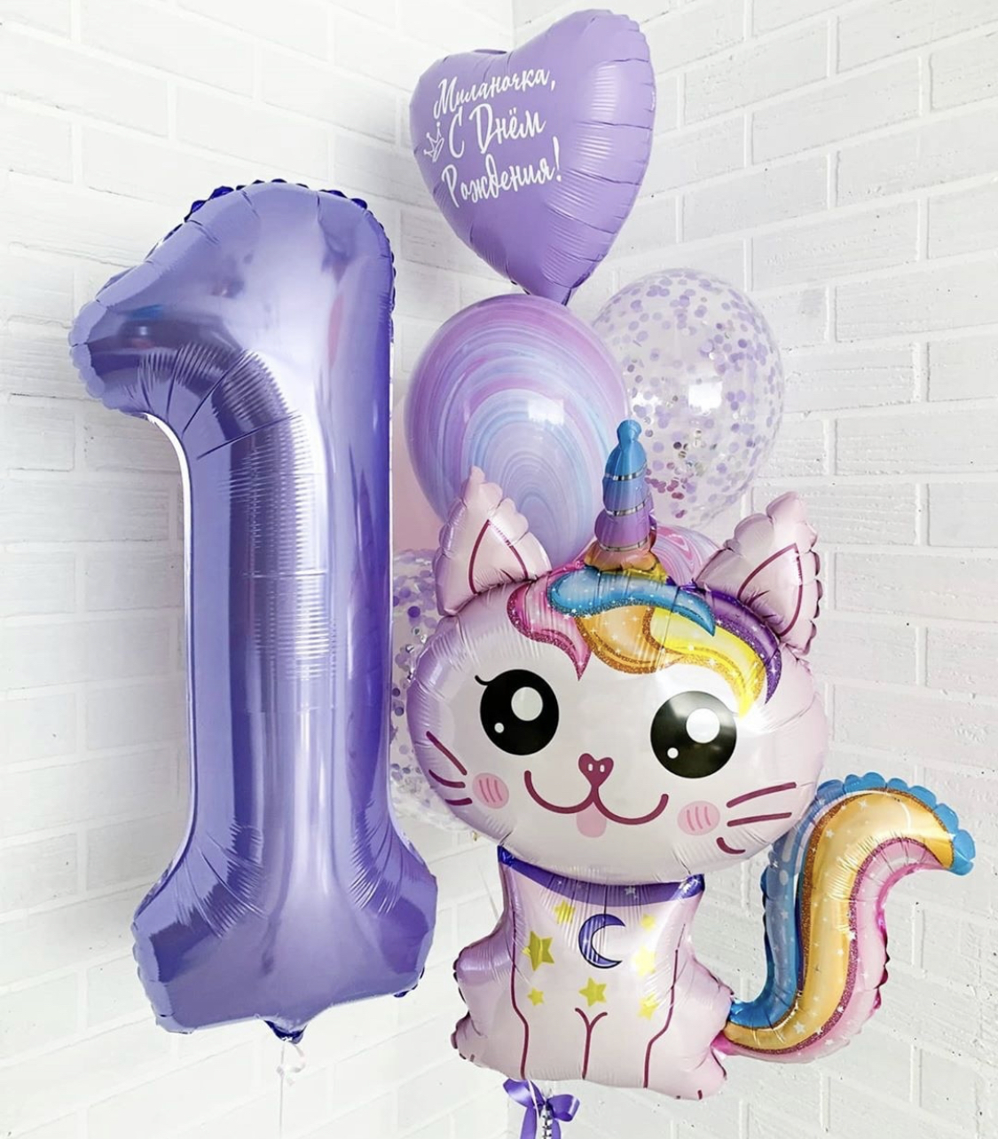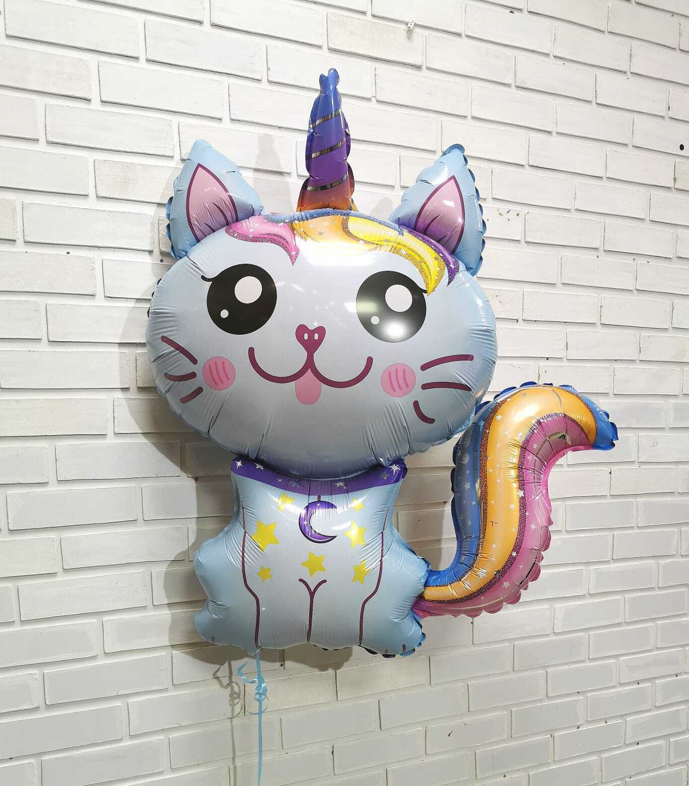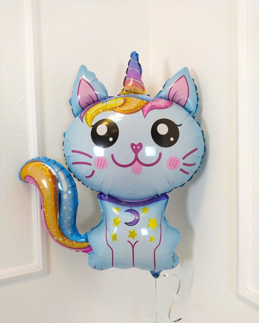 Фольгированная фигура в виде котенка-единорога — это милый и стильный элемент для детских праздников, дней рождения и фотозон.