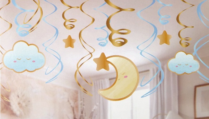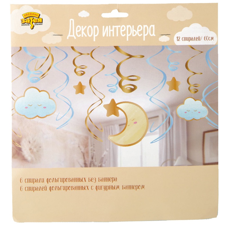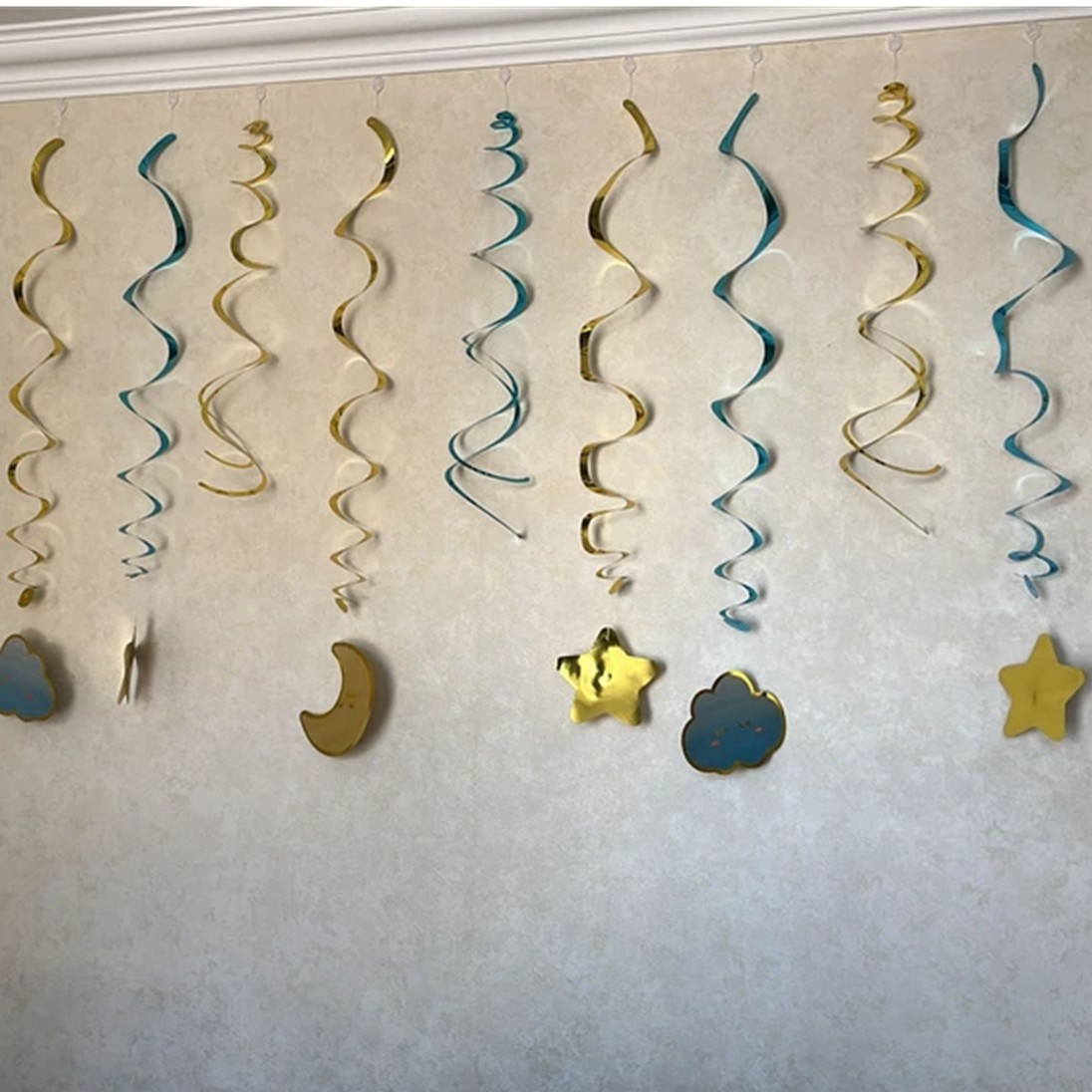 Подвесная декорация в виде спиралей в форме голубых облаков, золотой луны и звездочек, станет выразительным элементом оформления пространства. Дизайн создаёт стильное настроение, уместное для тематических праздников, мероприятий и оформления фотозон.