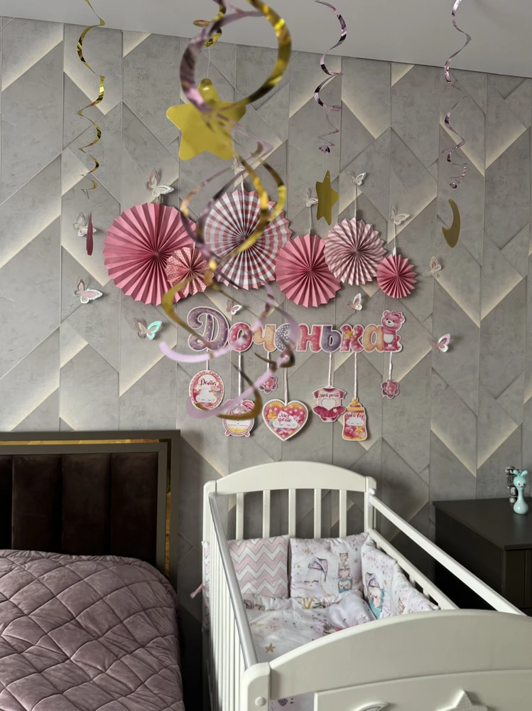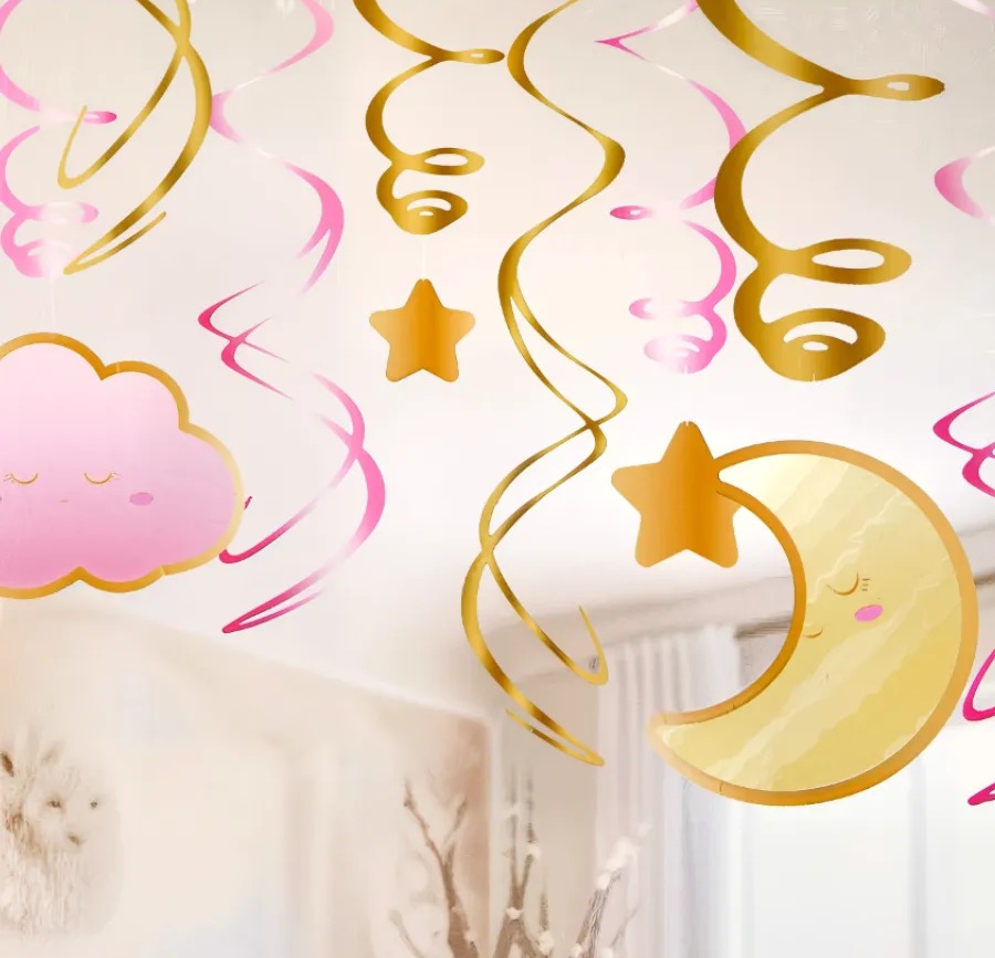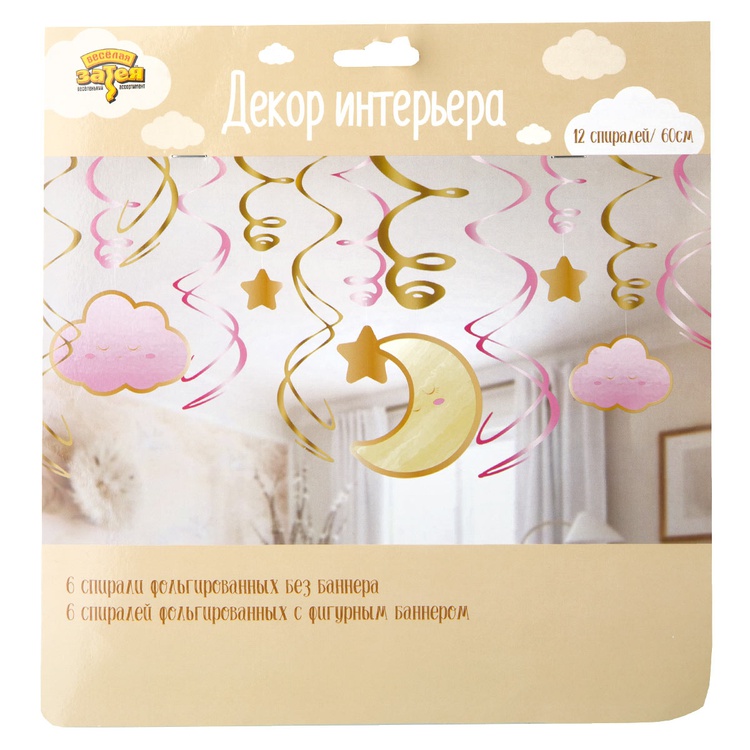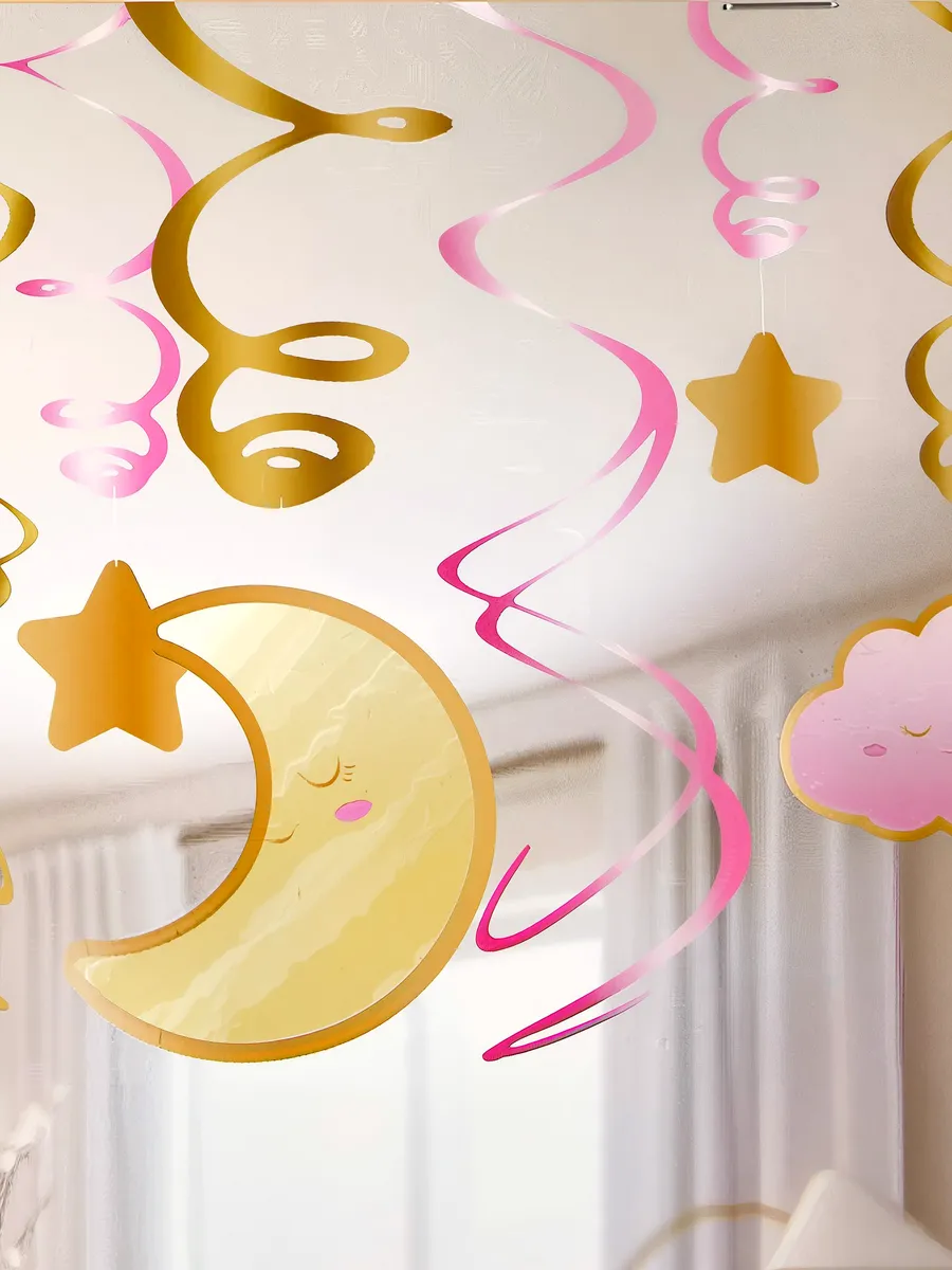 Подвесная декорация в виде спиралей в форме розовых облаков, золотой луны и звездочек, станет выразительным элементом оформления пространства. Дизайн создаёт стильное настроение, уместное для тематических праздников, мероприятий и оформления фотозон.